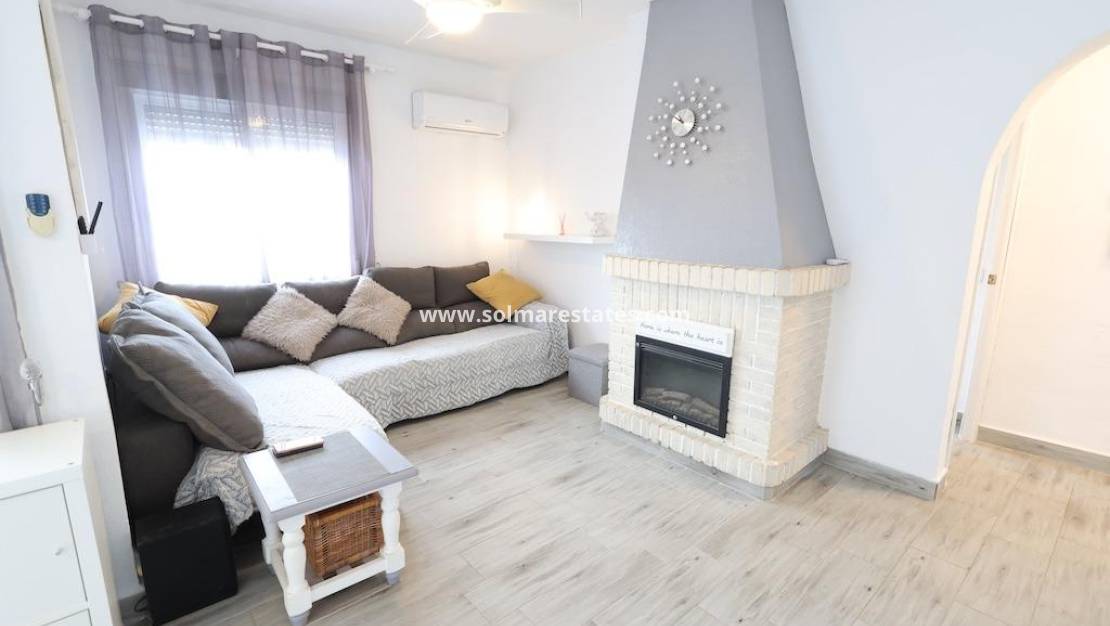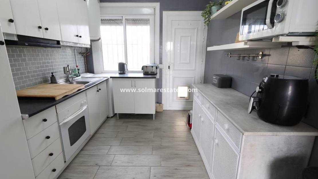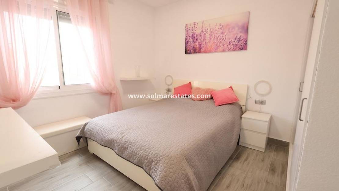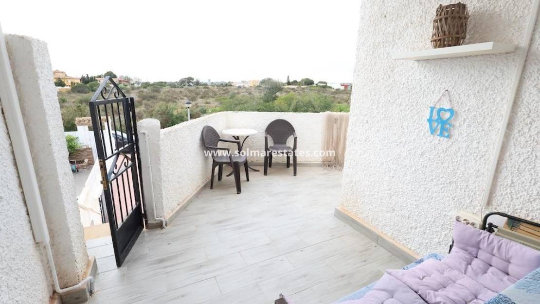 Bright bungalow on the top floor, ideal for enjoying peace and quiet and spacious outdoor areas.~~~~Bedrooms: 3 spacious bedrooms with security bars.~~Private outdoor area:~~Large private swimming pool, fully fenced for added security.~~Sunbathing area with artificial grass and sun loungers.~~Built-in barbecue area.~~Large dining terrace with outdoor shower and garden furniture.~~Extras: Separate access via external staircase, outdoor laundry/storage area and landscaped grounds with palm trees.~~Ideal for those seeking independence and a large private leisure area.~