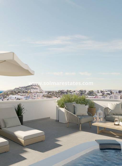 On the first floor are two double bedroom with fitted wardrobes. The bedroom to the front of the house has access to a terrace. Also on this first floor is a modern shower room. There are stairs from the first floor leading you to your own private roof solarium with outdoor kitchen area. Another amazing outdoor living space.