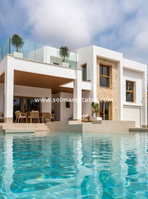 This stunning and spacious 4 bedroom detached villa is on a fantastic large private plot in Las Colinas Golf and Country Club, the most exclusive and prestigious golf resort in Costa Blanca with a driving range, 24 hour security, a shop and a choice of restaurants on the resort itself. This immaculate modern villa is cleverly divided into 4 areas connected by a hallway with huge windows. In one area you will find an open plan sleek kitchen and dining area, storage and washing room as well as a handy loo for guests.The living room offers gorgeous views towards the terrace, large well maintained garden and swimming pool. From the living room you have direct access to the terrace. On the ground floor you will find 3 double bedrooms, each with their own private en-suite bathroom. On the first floor you have the benefit of privacy from guests with only the impressive master bedroom with en-suite bathroom.This property has to been seen to be fully appreciated, and is light and bright with the huge windows taking advantage of the fabulous views. For your comfort and enjoyment all year round, this highly desirable villa comes with fully integrated hot and cold air conditioning throughout, as well as the great benefit of the swimming pool being heated! Within a 15 minute drive of a range of other perfectly maintained golf courses such as Campoamor, Villamartin and Las Ramblas and nearby blue flag beaches, at Cabo Roig, La Zenia and Playa Flamenca to name a few and the American-style open air shopping mall Zenia Boulevard which is open from 10am -10pm all year round.