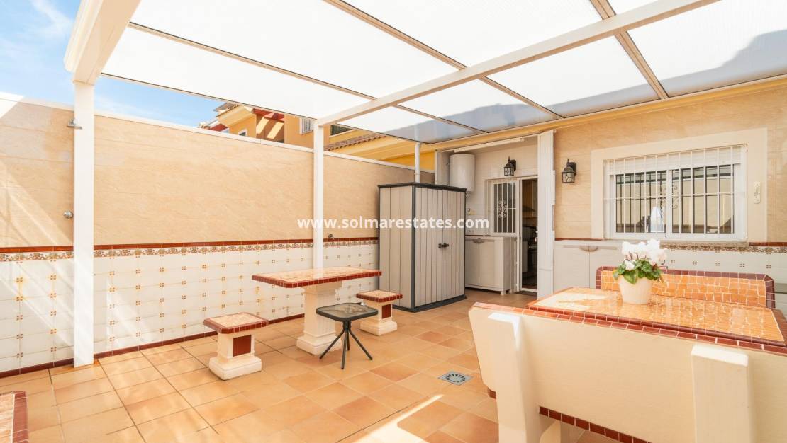 We present this fantastic 3-bedroom townhouse in the exclusive area of Villamartín, an ideal location to enjoy the sun and tranquility of the Costa Blanca. With 104 m2 of living space and a 130 m2 plot, this property offers everything you need to live comfortably and close to everything that matters to you.~~On the ground floor, the house features a spacious and bright living-dining room, a fully equipped independent kitchen with access to the west-facing rear terrace, a bedroom, and a full bathroom with a shower.~~Upstairs, you'll find the first floor, which includes two additional bedrooms, each with its own private terrace, and another full bathroom with a bathtub.~~On the second and top floor, there's a 15 m2 solarium where you can soak up the sun all day long.~~Enjoy your own oasis of tranquility with a spacious 30 m2 terrace, perfect for relaxing or entertaining, and a solarium to make the most of the views and the wonderful weather. Furthermore, its east-facing orientation guarantees excellent natural light throughout the day.~~Among the features that make this property stand out are air conditioning, built-in wardrobes, a practical laundry room, and an enclosed terrace on the first floor that expands the living space, providing greater comfort. It also boasts a large and attractive communal swimming pool, ideal for enjoying warm days and making the most of leisure time.~~The location is excellent, just 3.7 km from the beautiful beaches of La Zenia and Playa Flamenca, and surrounded by all essential amenities: La Zenia Boulevard shopping center is a 3-minute drive away, and there are supermarkets, schools, hospitals, parks, and playgrounds nearby. You'll also enjoy the proximity to the Villamartín golf course and easy access to public transportation.~~This house is being sold fully furnished and includes parking on the property.~~It's the perfect option for those looking for a functional, well-located home with everything you need to move in right away.~~Don't miss this opportunity! Contact us for more information and to arrange your visit.~~Price: €219,000. Taxes and closing costs not included (according to applicable regulations). A breakdown of additional costs will be provided before booking.~~In the case of a transaction with two intermediaries, the buyer's professional fees will be 1.5% of the final purchase price, with a minimum of €3,000, plus VAT (21%), unless expressly agreed otherwise. These fees are not included in the advertised price.