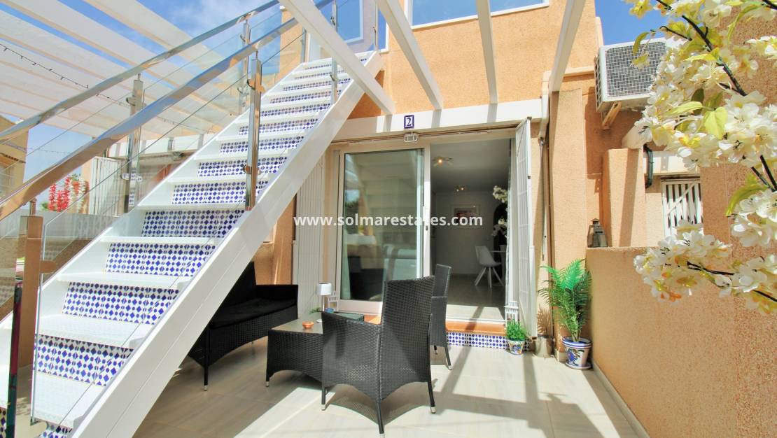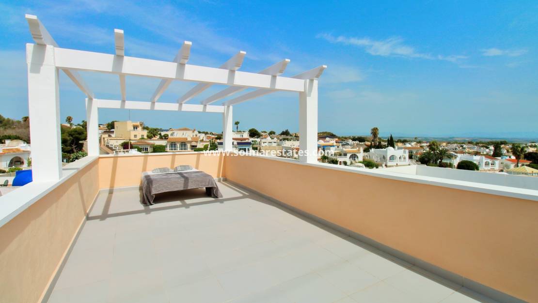To the front, a private tiled terrace provides a perfect space to relax and enjoy the Mediterranean climate. An external staircase leads to a generous private roof solarium, offering open views towards the sea and surrounding countryside—ideal for sunbathing, entertaining, or unwinding in total privacy.