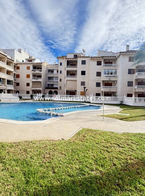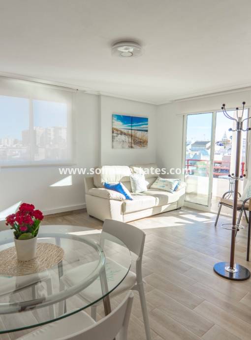 PRIME LOCATION 50m from Playa del Cura, Torrevieja beach is this elevated ground floor apartment. This fabulous 2 bedroom, 2 bathroom apartment has been reformed throughout with a brand new fully equipped kitchen along with 2 stylish bathrooms. The apartment has a huge living and dining room with access to a private glazed terrace with views down to the beach front. The property has two big bedrooms both with fitted wardrobes. The property has been tastefully reformed with modern floor tiling and is sold fully furnished and finished with air-conditioning. The property forms part of a very well maintained private complex where home owners have access to the communal showers and changing rooms to make it easy to wash-off the sand from the beach.