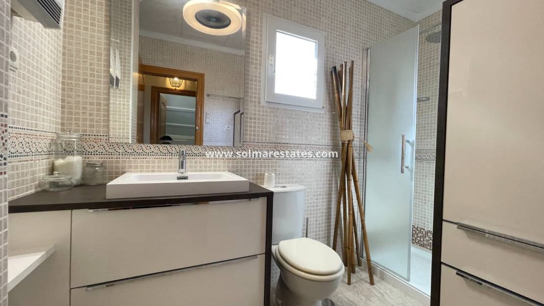 The front garden includes a private pool surrounded by artificial grass and ample storage. Additional features include air conditioning, electric radiators, and a heated towel rail, making this an exceptionally comfortable and stylish home. A truly outstanding property in one of the most desirable coastal locations on the Costa Blanca South.