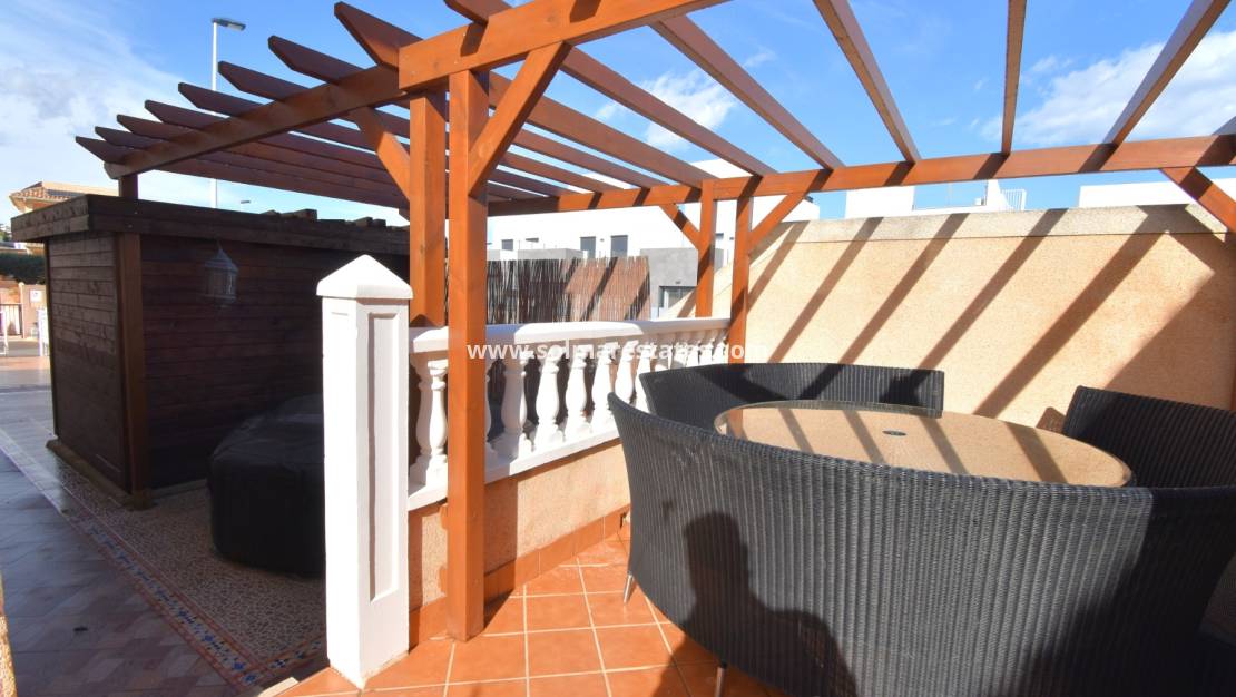 The exterior is designed for easy Mediterranean living: a fully tiled garden with private off-road parking, a landscaped area with shrubs and small trees, a rear patio ideal for barbecues, plus a storage room and wooden shed. Residents also benefit from access to a beautiful communal swimming pool with both tiled and lawned sunbathing areas.