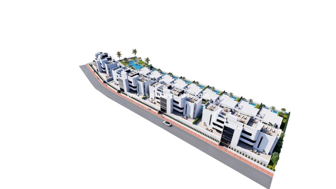 New Build Golf Front Apartments and Villas in La Serena Golf Los Alcazares Exclusive Residential Development Frontline to La Serena Golf Discover this exceptional new build residential development located frontline to La Serena Golf in Los Alcazares, one of the most desirable coastal towns on the Costa Calida. This exclusive community offers a premium lifestyle surrounded by nature, open views and direct access to a renowned 18 hole golf course known for its flat terrain, scenic lakes and technical challenges. Ideally situated just 1.7 km from the beaches of the Mar Menor and the town center, residents can enjoy both tranquility and easy access to restaurants, shops and all essential services. Los Alcazares is well known for its relaxed atmosphere, long promenades and warm shallow waters, making it perfect for year round living or holiday stays. Modern Apartments with Terraces and Private Solariums The development includes 36 contemporary apartments distributed across four blocks. Buyers can choose between two or three bedroom layouts with two bathrooms, including an en suite. Ground floor apartments feature spacious terraces with the option to add a private pool. Middle floor units offer generous outdoor terraces, while penthouses include private solariums ideal for sunbathing and outdoor dining. All apartments include underground parking and a storage room with elevator access. The community also offers beautifully landscaped Mediterranean gardens and a large communal swimming pool for residents to enjoy. Stylish Single Level Villas with Private Pool In addition to the apartments, the development offers nine exclusive single level villas. These homes feature three bedrooms, two bathrooms and an additional guest toilet, all designed to provide seamless indoor and outdoor living. Each villa includes a private swimming pool, garden, storage room and private parking. A spacious open basement provides additional flexible space that can be adapted to suit individual needs such as a gym, entertainment area or extra storage. High Quality Finishes and Energy Efficient Design All properties are built with high quality materials and modern specifications. Features include aluminum exterior carpentry with thermal break, fully equipped bathrooms with vanity units and glass shower screens, and pre installation for ducted air conditioning and furnished kitchens in apartments. Villas come with fully installed air conditioning systems and fully equipped kitchens with appliances. Elevators are available in apartment blocks, ensuring comfort and accessibility. Prime Location Close to Golf, Beaches and Amenities This development offers excellent connectivity to key points of interest. Murcia International Airport is 35 km away and Alicante Airport is 95 km. The marina of Los Alcazares is just 2 km away, Dos Mares shopping center is 15 km and Roda Golf is only 4 km from the development. Cartagena city center is located 25 km away. Ideal Investment and Mediterranean Lifestyle Opportunity This golf front development offers a unique opportunity to enjoy modern living in a privileged setting close to both the sea and golf. Contact us today to receive more information or to arrange a viewing and find your perfect home in Los Alcazares.