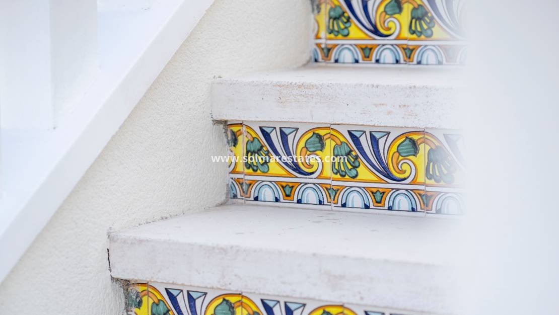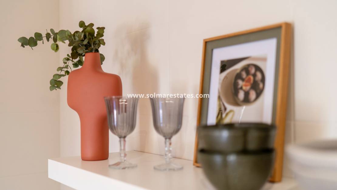 An external staircase leads from the balcony to a large private roof terrace. This impressive space includes a storage room and a built-in BBQ area, perfect for outdoor dining and entertaining, while offering views of the salt lakes of Torrevieja and La Mata.