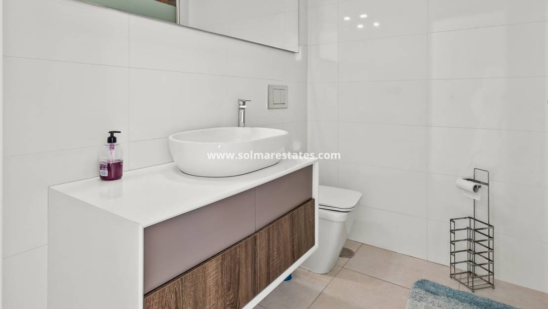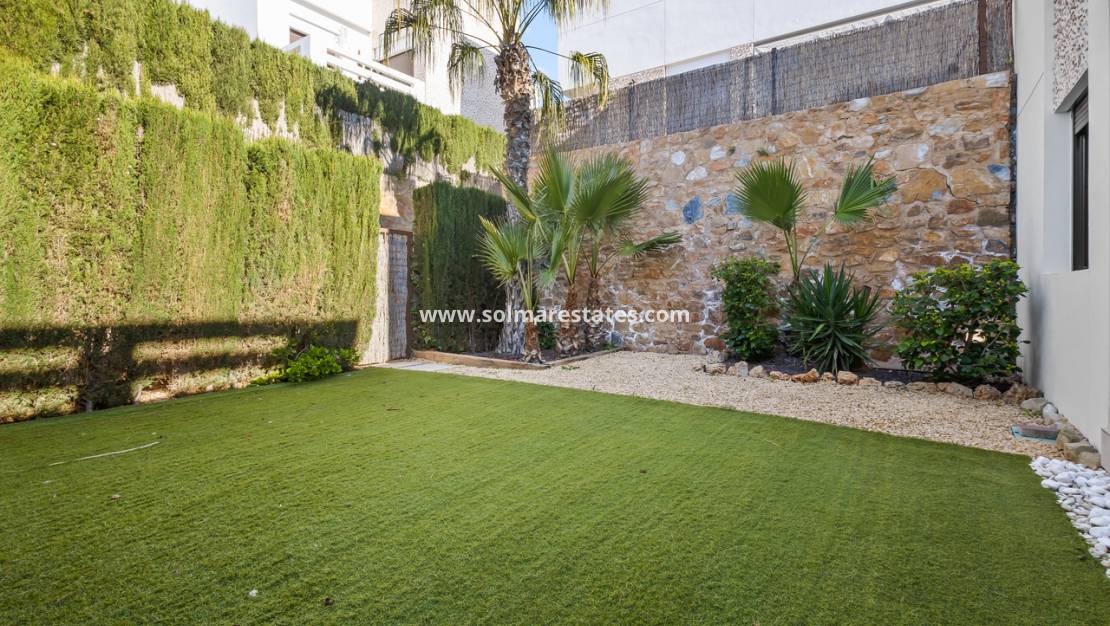 The home is thoughtfully distributed over two levels, offering a bright and modern open-plan design. The ground floor features a spacious living and dining area with a contemporary open-plan kitchen, seamlessly connecting the front and rear gardens—perfect for indoor-outdoor Mediterranean living. This level also includes two generously sized bedrooms and a family bathroom, ideal for guests or convenient single-level living.