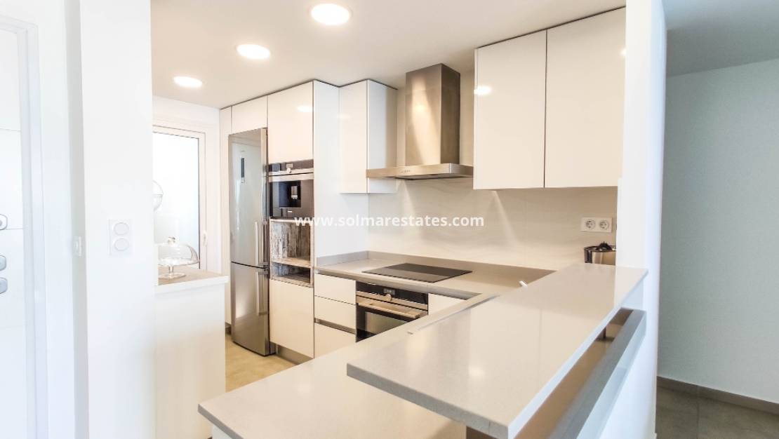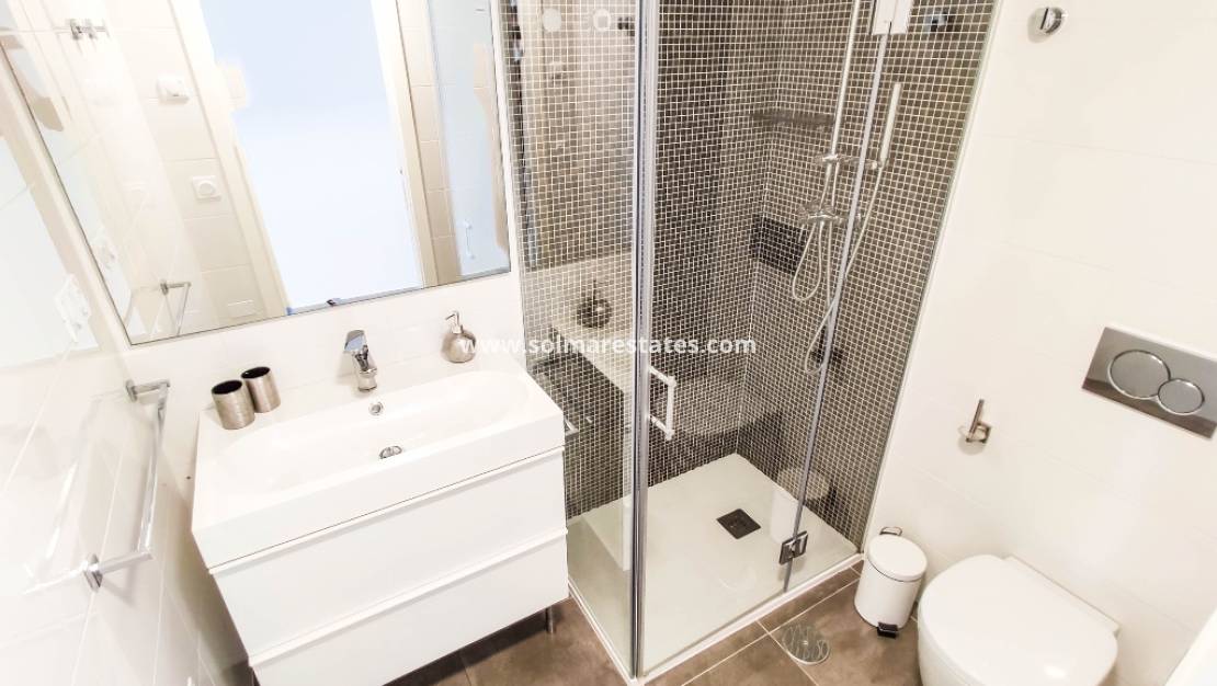 The master bedroom benefits from sea views, large fitted wardrobes and an en-suite bathroom with walk-in shower. The second bedroom also includes fitted wardrobes. The family bathroom features a walk-in shower, wash basin and WC with additional storage.