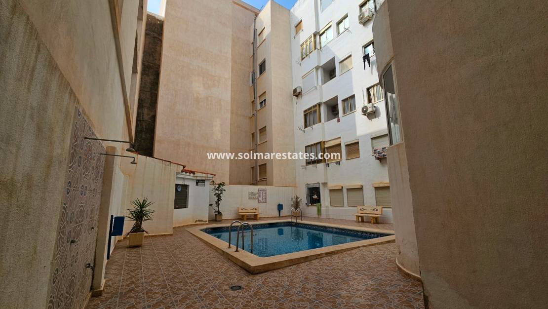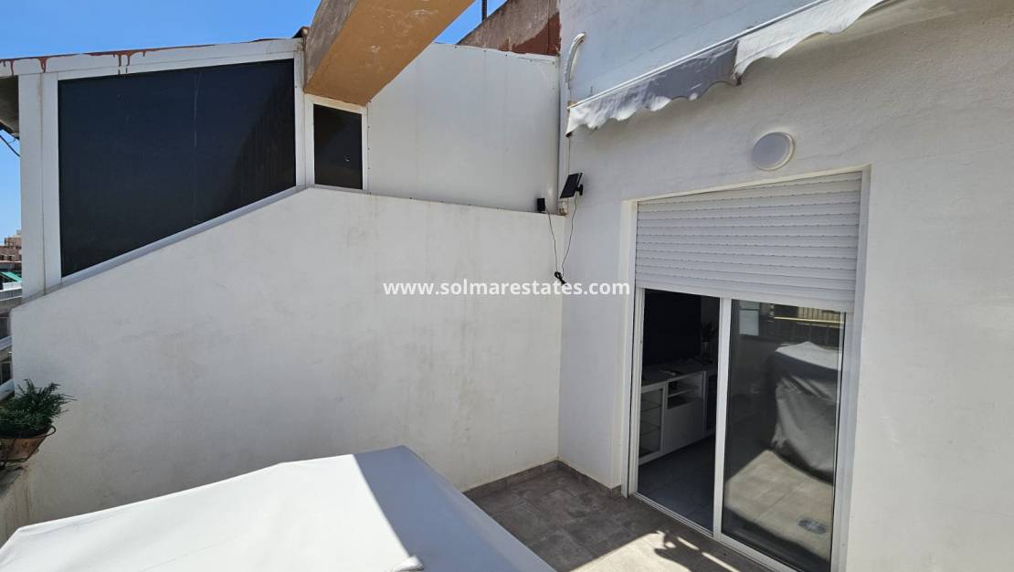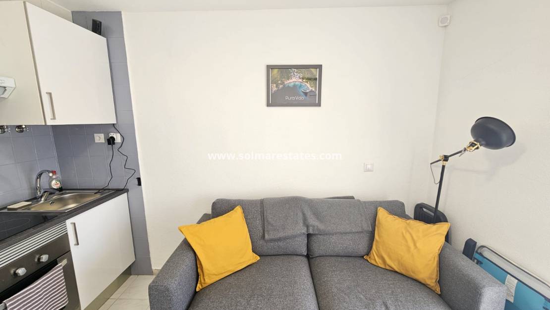 Vardagsrum/matsal med varm och kall luftkonditionering, nyutrustat öppet kök, 1 x sovrum, 1 x duschrum, balkong utanför vardagsrummet, privat takterrass med havsutsikt, gemensam pool, hiss, säkert gated community och mycket mer.