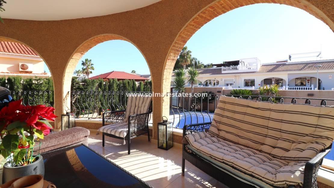 Denna fristående villa med tre sovrum i söderläge i Monte Azul, ligger i ett lugnt bostadsområde med en bar och restaurang i närheten. Bara fem minuters bilresa till både Benijofar och Quesada, där du hittar alla viktiga bekvämligheter, inklusive stormarknader, butiker, en mängd barer och restauranger. Golfbanan La Marquesa ligger bara 10 minuter bort, medan de vackra stränderna på Costa Blanca kan nås på bara 15 minuter. Belägen på en generös 400m2 tomt, är denna 120m2 villa belägen på ett plan och erbjuder en rymlig böjd och välvd ingångsterrass, perfekt för att koppla av eller äta utomhus med utsikt över poolen. Det ljusa och luftiga vardagsrummet/matsalen har en öppen spis med vedbrännare och en luftkonditionering för komfort året runt. Köket i öppen planlösning är välutrustat och bekvämt anslutet till vardagsrummet. Villan har tre dubbelrum, alla med inbyggda garderober, plus ett familjeduschrum och ett eget badrum till huvudsovrummet. Utvändigt är trädgården designad för lågt underhåll, huvudsakligen kaklad med en stenyta, planterade bårder, buskar och mogna palmer. Det finns en 8 x 4 privat pool, perfekt för att svalka dig i den varma spanska solen, samt terrängparkering med en carport. Ett fantastiskt familjehem med ett fantastiskt läge, som erbjuder komfort, bekvämlighet och uteliv på Costa Blanca South!