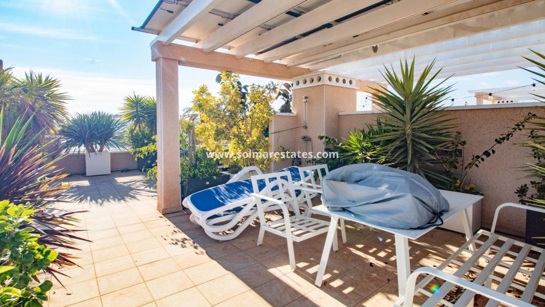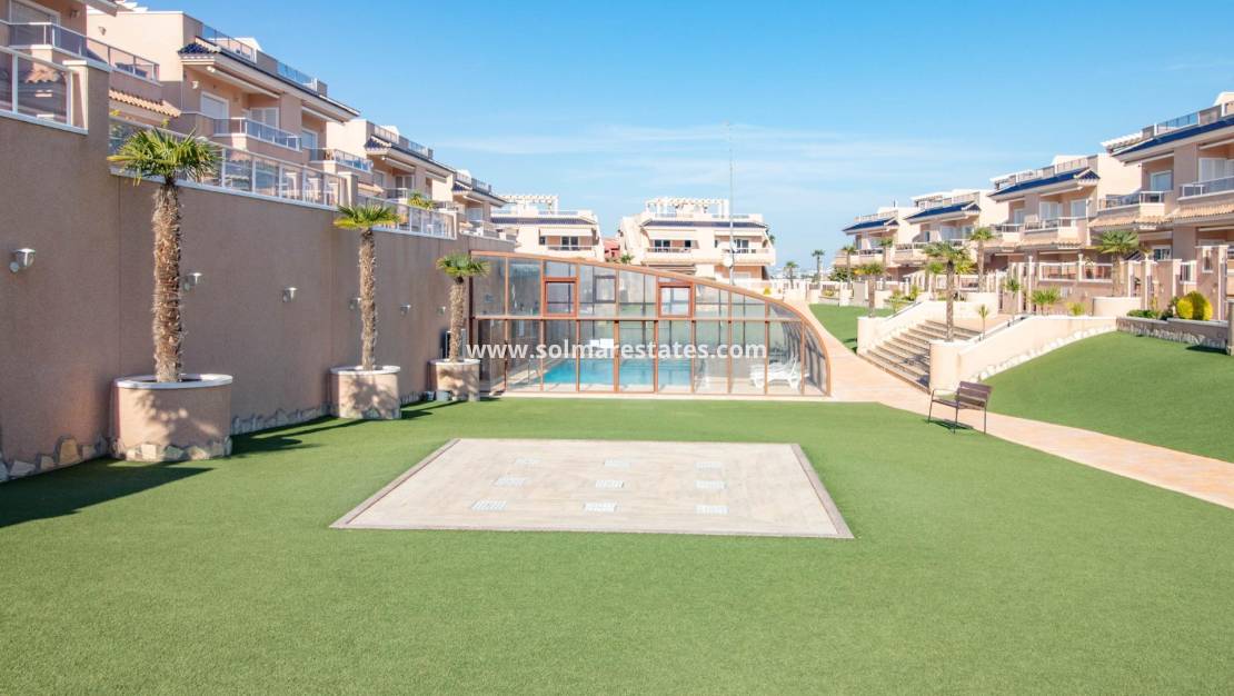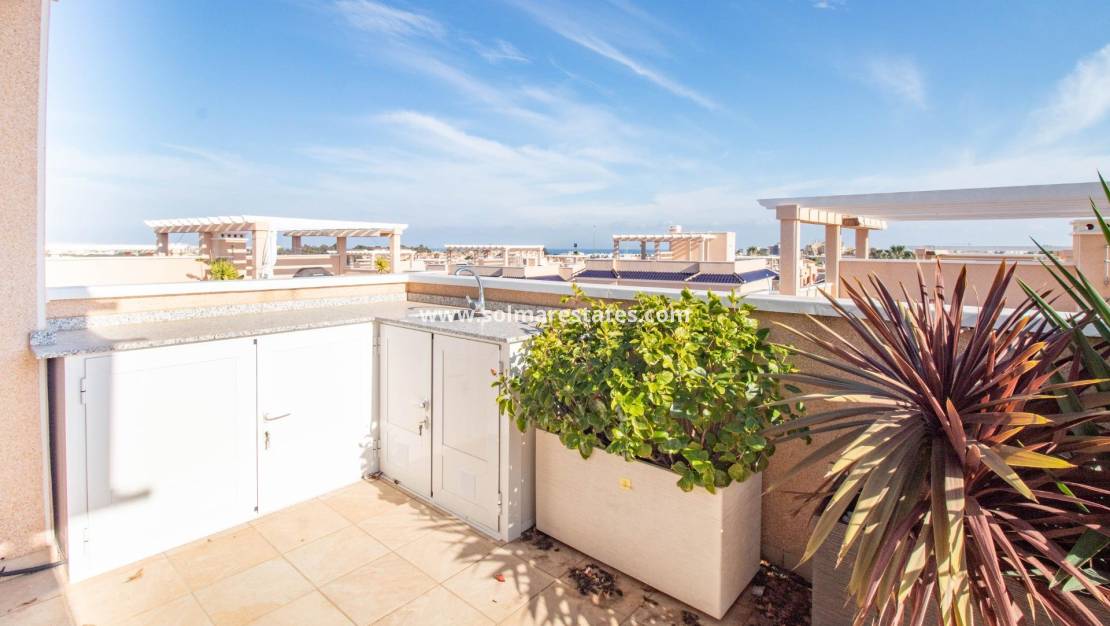 Denna charmiga bungalow på översta våningen erbjuder en bekväm och elegant livsstil med rymliga och välfördelade utrymmen. Den har två sovrum, ett av dem med eget badrum. Vardagsrummet med öppen planlösning ansluter till ett modernt amerikanskt kök som ger direkt tillgång till terrassen, vilket skapar en perfekt miljö för att njuta av utomhusliv. Dessutom kan du från vardagsrummet också komma åt en balkong i söderläge, perfekt för att ta vara på soltimmarna.~~Det privata 56 kvadratmeter stora solariumet blir en oas av lugn, utrustad med jacuzzi och omgiven av tropiska växter, vilket gör att du kan njuta av avkopplande utsikt mot bostadsområdet. På bottenvåningen finns ytterligare en privat terrass på 21 kvadratmeter, perfekt för utomhusaktiviteter. Huset har solpaneler och en parkeringsplats. ~~Detta gated community erbjuder en mängd lyxiga bekvämligheter, inklusive en uppvärmd pool och bastu, såväl som en utomhuspool, gemensamma utrymmen som är perfekta för avkoppling och en lekplats, vilket gör detta till det perfekta hemmet för familjer som söker livskvalitet och lugn.~~Punta Prima är ett lugnt och attraktivt kustområde i Torrevieja, Alicantes gyllene sandstrand och sin vackra vattenstrand. Perfekt för dem som vill njuta av havet och solen, den har en strandpromenad och spektakulära vyer. Området erbjuder ett bra utbud av restauranger, butiker och service samt nära till golfbanor och naturparker. Perfekt för dig som letar efter en avslappnad atmosfär och en utmärkt livskvalitet nära havet.
