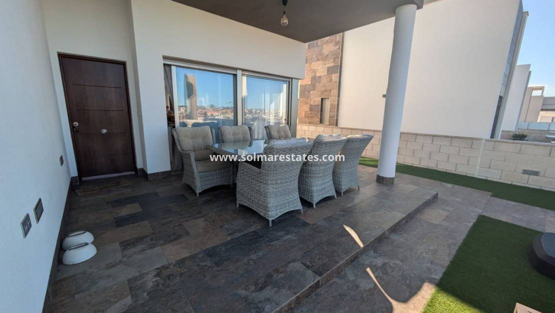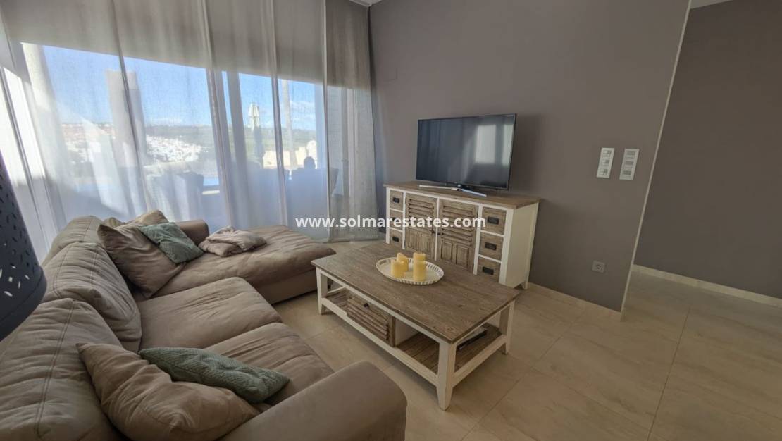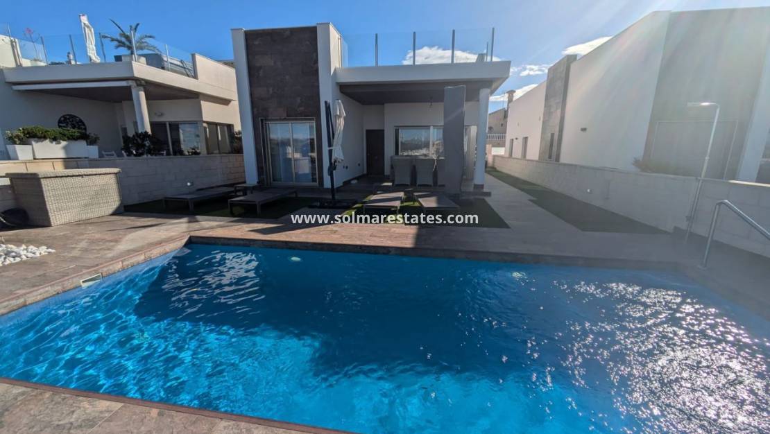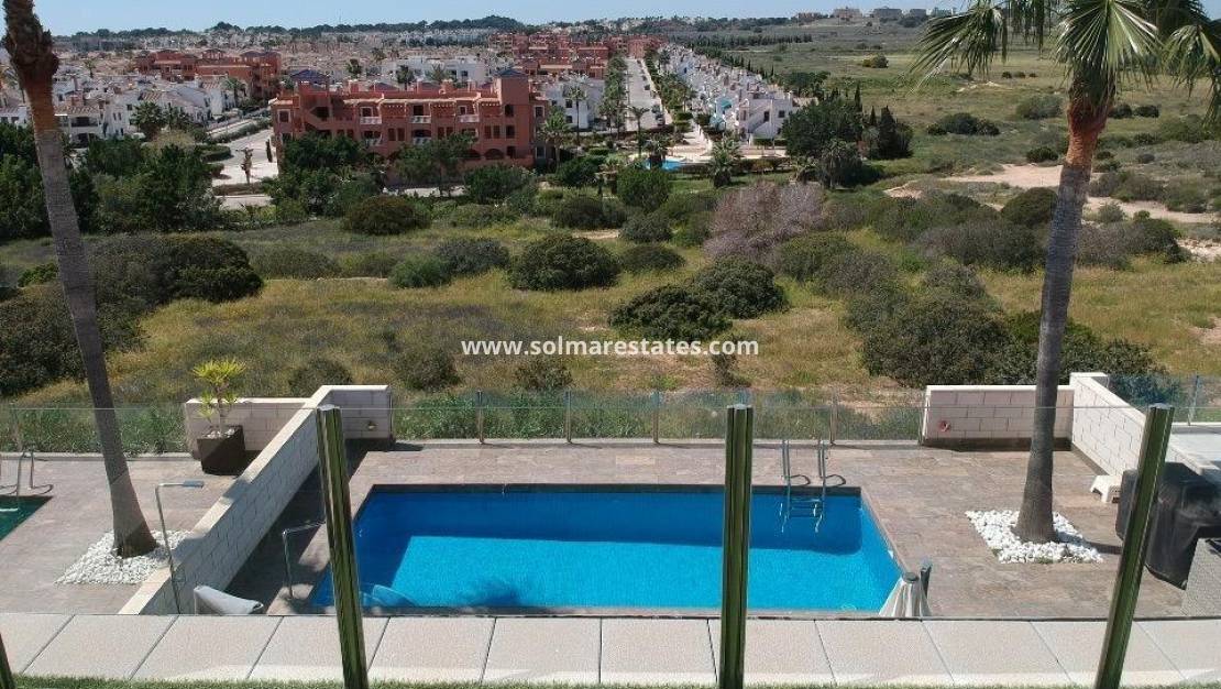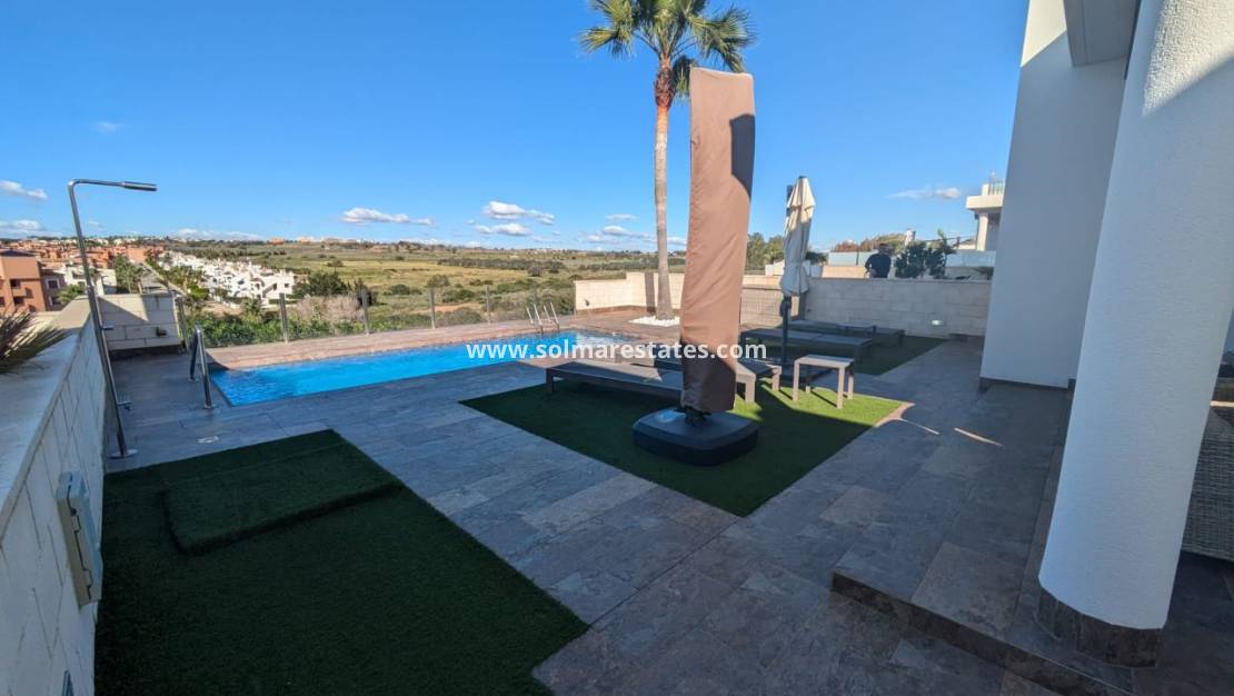 Beläget på en tomt i söderläge på 312m2 med en lågskött trädgård med privat pool, grönområden och terrasser där du kan koppla av och njuta av den vackra privata utsikten över det omgivande området. Fastigheten består av 3 sovrum, 2 badrum (ett med eget badrum) och ett öppet vardagsrum/matsal och kök med ett separat grovkök. Förutom den stora trädgården har du också ett mycket stort solarium där du kan njuta av mer av utsikten och till och med se havet! Fastigheten har möblerats till en mycket hög standard och kommer med centraliserad luftkonditionering, off-road parkering med en elektrisk uppfartsgrind, elektriska persienner i hela och ett förråd.