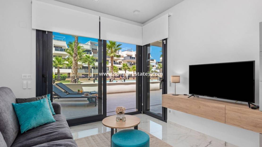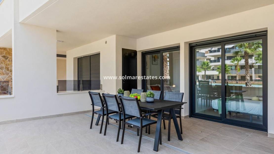 Denna vackra lägenhet på bottenvåningen ligger i Amanecer IX. Lägenheten har 2 sovrum, 2 badrum och ett öppet kök. Det är en central lägenhet, vilket innebär att den har en större terrassyta och tillgång till terrassen från varje sovrum och vardagsrummet. Terrassen är en rymlig 48 m² stor och erbjuder utsikt över trädgården och poolen.