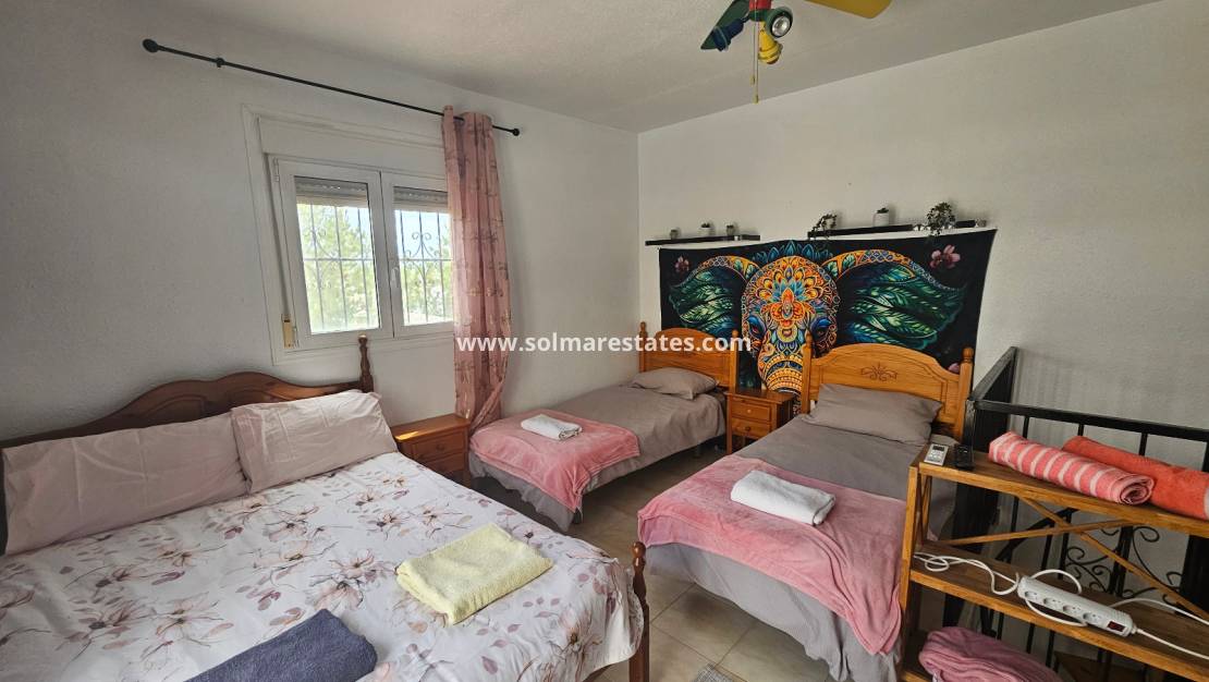 Vardagsrum med öppen spis och takfläkt, separat matplats, separat kök, 3 sovrum med dubbelsäng, 2 badrum.
