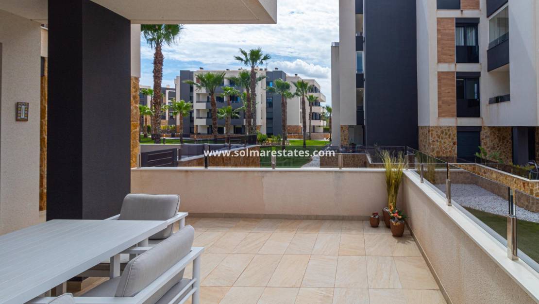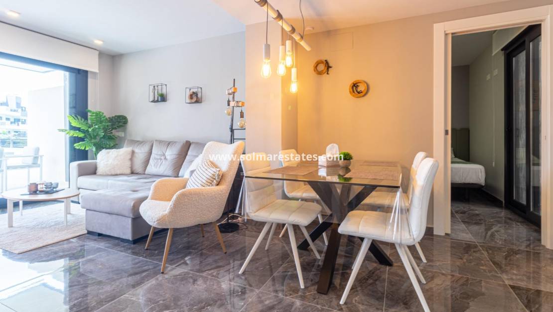 Välkommen till ditt nya hem på Residencial Amanecer VI! Denna charmiga lägenhet på bottenvåningen, belägen i det prestigefyllda Los Almendros-området, erbjuder ett bekvämt och avkopplande boende. Njut av en rymlig terrass med fantastisk utsikt över de grönskande gemensamma trädgårdarna, den perfekta platsen att koppla av eller njuta av måltider utomhus. Med två sovrum och två badrum (ett ensuite) är denna lägenhet rymlig och funktionell. Det fullt utrustade öppna köket smälter sömlöst in i vardagsrummet och skapar en öppen och ljus atmosfär. En praktisk innergård ger ännu mer naturligt ljus och en extra touch av avskildhet. Inbyggda garderober erbjuder gott om förvaringsutrymme, och bekvämligheten med kanaliserad luftkonditionering (varm/kall) säkerställer din komfort året runt. Lägenheten säljs fullt möblerad, redo att inflyttas. Den inkluderar också en underjordisk parkeringsplats och ett förråd, vilket ger praktiska lösningar för förvaring och parkering. Residencial Amanecer VI är känt för sin lugn och familjevänliga atmosfär. De välskötta gemensamma trädgårdarna och gemensamma utrymmena erbjuder en idealisk miljö för att njuta av din fritid. Dess utmärkta läge i Los Almendros ger dig nära alla nödvändiga bekvämligheter, såsom stormarknader, restauranger och köpcentra. Och bäst av allt: områdets drömstränder ligger bara en kort bilresa bort! Tänk dig att njuta av solen och havet på några minuter. Missa inte möjligheten att bo i detta paradis. Kontakta oss idag för att boka en visning.