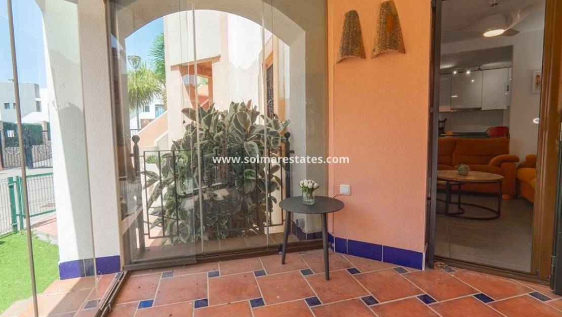 Vardagsrum/matsal med varm och kall luftkonditionering, nyutrustat kök med öppet kök och förvaringsutrymme, 2 dubbelrum, båda med inbyggda garderober, det största sovrummet har eget duschrum, 1 gästduschrum, inglasad terrass, trädgård, gemensam pool, gemensam parkering och mycket mer.