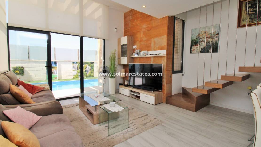 Denna fantastiska fristående villa med tre sovrum och tre badrum ligger i det mycket attraktiva Palm Beach II-området i Lomas de Cabo Roig , bara 2 km från de vackra blåflaggade stränderna Aguamarina och La Glea (Campoamor) .