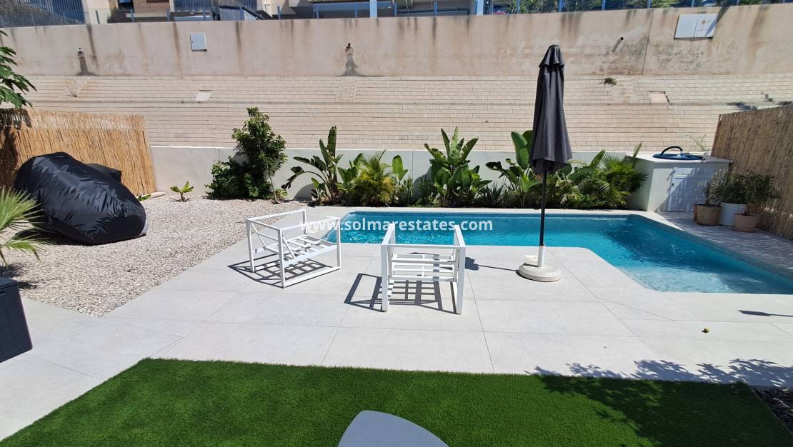 Villan har en privat pool i en elegant, lättskött trädgård med konstgräs – en idealisk plats för avkoppling, underhållning eller att njuta av den spanska solen. Ett stort soldäck på taket ger ännu mer utrymme för att njuta av medelhavsklimatet och panoramautsikten.