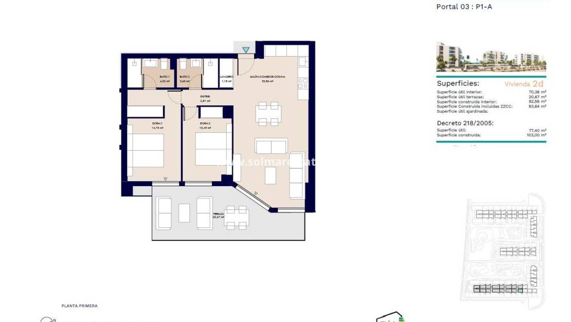 NYBYGGT BOSTADSKOMPLEX I ALMERIMAR Nybyggd exklusiv utveckling av lägenheter med 2 och 3 sovrum anpassade till dina behov i ett privilegierat område i Almerimar. Moderna lägenheter har otrolig havsutsikt, finish av högsta kvalitet, stora terrasser och ljusa utrymmen, samt extraordinära gemensamma områden som har en concierge- och säkerhetstjänst, pooler i olika storlekar, ett solariumområde, gym, garage, förråd och omfattande trädgårdsområden där du kan höra ljudet av havets vågor. Nybyggt bostadsområde med imponerande panoramautsikt över Medelhavet beläget bredvid strandpromenaden, som går längs stranden i Almerimar, där du kan koppla av. Komplexet ligger mycket nära alla tjänster du behöver dagligen, till exempel stormarknader, banker, exklusiva skolor och mycket mer. Dessutom, om du gillar att öva din swing utan att gå för långt hemifrån, ligger de 27 hålen på Almerimar golfbana bara 3 minuter bort. Om du föredrar att segla, bara 5 minuter bort med bil har du marinan till ditt förfogande. Complex erbjuder också en anslutning på mindre än 2 timmar med Malaga, Sierra Nevada och flygplatserna i Malaga, Almeria och Granada.