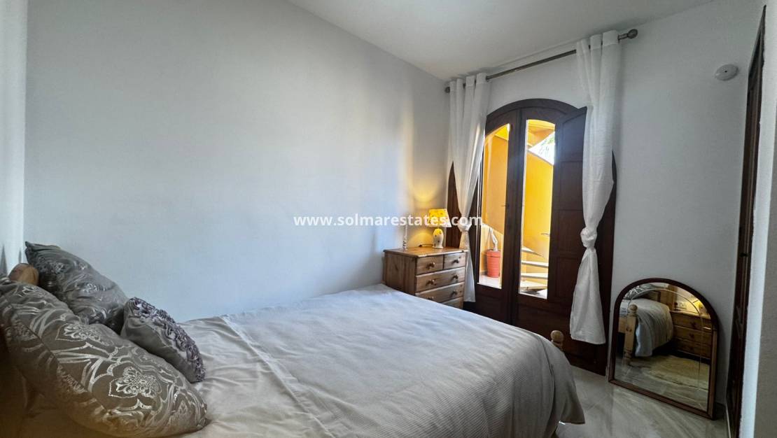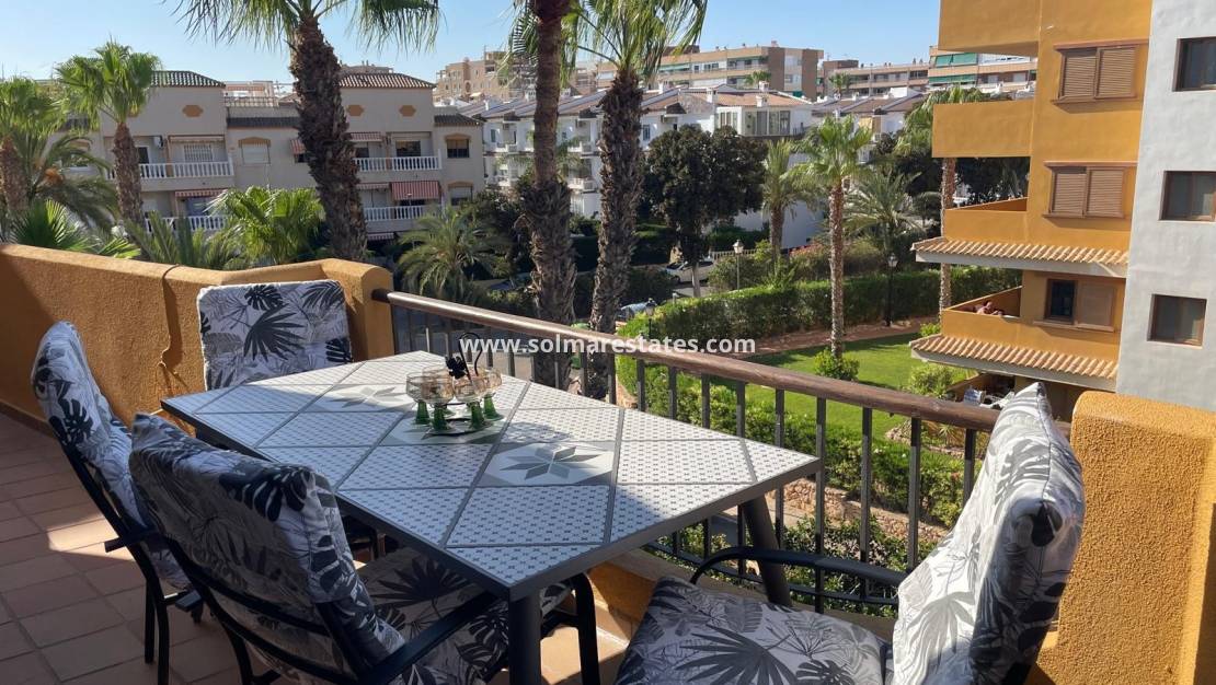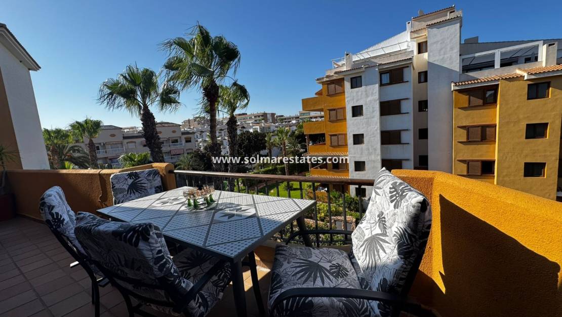 Till salu finns en ljus och mysig takvåning med två sovrum belägen på översta (tredje) våningen i det prestigefyllda bostadskomplexet Panorama Park i Punta Prima, bara 500 meter från havet .