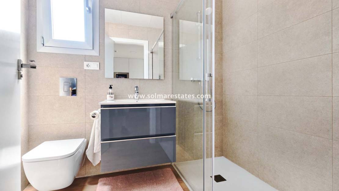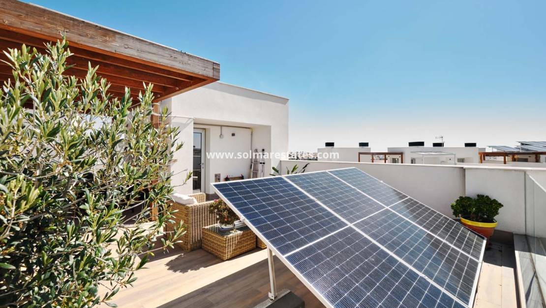 En intern trappa leder till den imponerande privata takterrassen med panoramautsikt över poolen och trädgårdarna, plus utsikt över havet och Mar Menor i fjärran. Utrustad med en pergola för skugga och en utomhusdusch är detta utrymme perfekt för underhållning eller avkoppling.