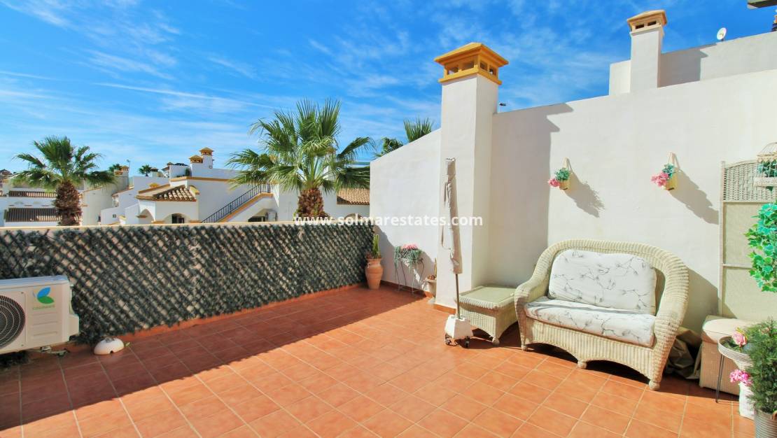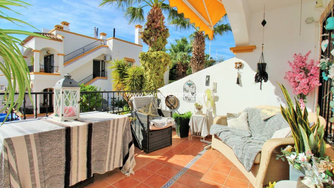 Bottenvåningen erbjuder ett ljust och rymligt vardagsrum/matsal med öppet kök och angränsande tvättstuga. På baksidan finns två dubbelrum med inbyggda garderober och ett familjebadrum. Franska dörrar från ett sovrum leder till en kaklad trädgård/terrass på baksidan, komplett med utdragbara markiser för skugga och komfort. På framsidan finns en ytterligare kaklad trädgård med en upphöjd täckt terrass med utsikt över poolen och inkluderar ett användbart förråd.