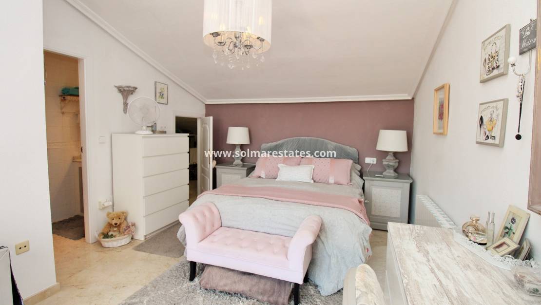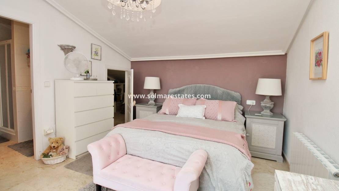 På första våningen har huvudsovrummet högt i tak, ett eget badrum med duschkabin, inbyggt förråd och direkt tillgång till ett stort privat solarium. Solariumet, som också är tillgängligt från avsatsen, har solsken hela dagen och utsikt över poolen.