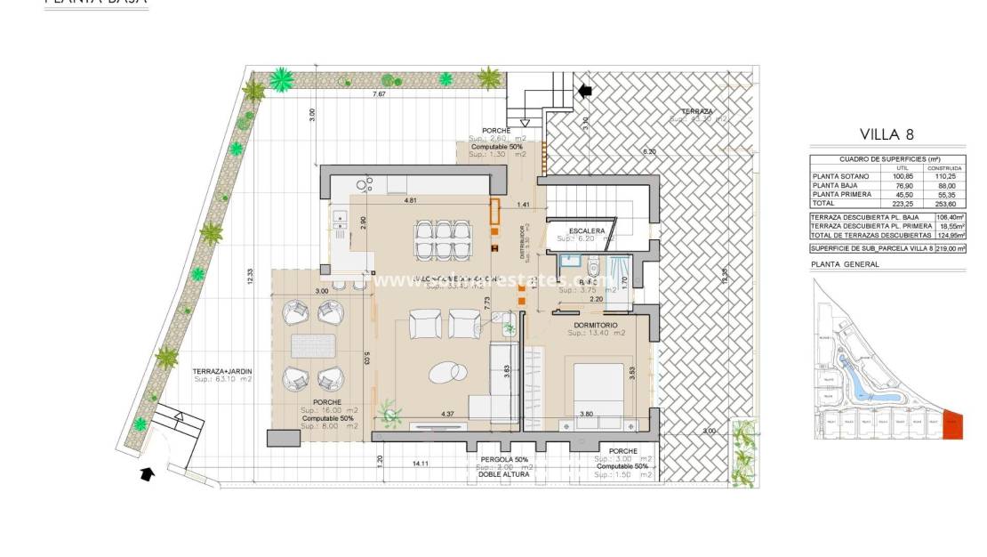 Nybyggda villor och bungalower bara 250 meter från stranden i Mar de Pulpí Exklusivt bostadsprojekt med villor och bungalower nära havet Upptäck ett exceptionellt nytt bostadsområde beläget bara 250 meter från stranden La Entrevista i Mar de Pulpí, Almería. Detta exklusiva bostadsområde erbjuder två olika boendealternativ: 10 fristående villor och 8 bungalows, alla utformade för att erbjuda rymliga interiörer och högkvalitativa utomhusytor. Beläget i ett av de lugnaste och vackraste områdena på Costa de Almería är detta projekt idealiskt för dig som söker ett modernt och bekvämt hem nära havet, omgivet av naturskönhet och alla nödvändiga bekvämligheter. Lyxvillor med garage i källaren och privata terrasser Villorna har tre rymliga sovrum, alla med eget badrum. På bottenvåningen finns ett generöst sovrum, medan den övre våningen har ytterligare två sovrum med tillgång till privata terrasser. Garaget i källaren, som är direkt anslutet till villan, erbjuder plats för minst två bilar och cyklar, med naturlig belysning och ventilation samt generöst förvaringsutrymme. Eleganta bungalower med privata trädgårdar eller solterrasser Välj mellan bungalower på bottenvåningen med privata trädgårdar eller alternativ på övervåningen med privata solarium. Varje bungalow har två sovrum, två badrum och en privat pool eller jacuzzi. De har även hissar, vilket förbättrar tillgängligheten och komforten. De stora sovrummen har klädkammare och stora inbyggda garderober, medan de stora terrasserna med barområden gör det till en fröjd att umgås och koppla av. Komfort, stil och premiumfunktioner Alla bostäder i området är utrustade med: Dubbelglasfönster med solskydd och värmeisolerande ram Elektrisk golvvärme i alla badrum Luftkonditionering (värme och kyla) Motoriserade fönsterluckor Moderna badrum med hängande möbler, speglar och duschväggar Energieffektiv varmvattenproduktion via aerotermiska system Bostadsområdet har också en gemensam pool i flera nivåer, som erbjuder en gemensam plats för avkoppling och njutning. Utmärkt läge på Costa de Almería Bara 250 m från sandstranden och endast 3 km från San Juan de los Terreros kan boende njuta av ett brett utbud av bekvämligheter, inklusive stormarknader, restauranger, butiker och viktiga tjänster. Avstånd till viktiga sevärdheter: Stränderna i La Entrevista – 0,25 km San Juan de los Terreros – 3 km Aguilón golfbana – 7 km Águilas centrum och småbåtshamn – 12 km Murcia-Corvera flygplats – 95 km Almería flygplats – 115 km Säkra ditt drömhus vid havet Oavsett om du väljer en villa eller en bungalow erbjuder detta bostadsområde en perfekt blandning av kvalitet, läge och livsstil. Kontakta oss idag för mer information eller för att boka en visning – ditt perfekta hus vid kusten väntar på dig i Mar de Pulpí.