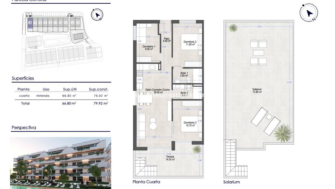Nybyggda turistlägenheter i Santiago de la Ribera, San Javier – bara 750 meter från stranden Exklusivt bostadsområde på Costa Cálida Detta exklusiva bostadsområde med 125 turistlägenheter ligger i Santiago de la Ribera (San Javier), en charmig kuststad på Costa Cálida, känd för sina vackra sandstränder, avslappnade medelhavsliv och utmärkta klimat året runt. Med Mar Menor bara 750 meter bort erbjuder dessa bostäder den perfekta kombinationen av komfort, stil och närhet till havet. Moderna lägenheter med flera alternativ Bostadsområdet erbjuder rymliga lägenheter med 3 sovrum och 2 badrum, inklusive ett master bedroom med eget badrum. Köpare kan välja mellan: Lägenheter på bottenvåningen med privat trädgård Lägenheter på mellanvåningen med stora terrasser Takvåningar med privat solarium Varje bostad är utformad för att maximera naturligt ljus och utomhusliv. Funktioner inkluderar fullt utrustade och möblerade kök med vitvaror, inomhus- och utomhusbelysning, badrum med möbler och duschväggar. Varje fastighet har en parkeringsplats på markplan, medan underjordisk parkering och förråd finns tillgängliga mot en extra kostnad. Förstklassiga bekvämligheter och tjänster Ägarna kommer att kunna njuta av en modern byggnad utrustad med hissar, två gemensamma pooler och vackert anlagda trädgårdar. Bostäderna har förinstallation av luftkonditionering för komfort året runt. En smart investeringsmöjlighet Dessa lägenheter har redan beviljats turistlicens, vilket gör dem till en utmärkt investering för semesteruthyrning. Ägarna kan generera intäkter genom korttidsuthyrning och samtidigt njuta av fastigheten för sina egna familjesemestrar. Observera att dessa bostäder är avsedda för semesterbruk och inte kan användas som permanenta bostäder. Utmärkt läge i San Javier Bostadsområdet är strategiskt beläget nära alla viktiga tjänster och fritidsaktiviteter. Avstånd till viktiga sevärdheter: Mar Menor-stranden: 750 m La Ribera shoppingcenter: 2 km Dos Mares shoppingcenter: 3 km Roda Golf: 5 km Lo Pagán Marina: 4 km Murcia flygplats (Corvera): 40 km Cartagena: 30 km Murcia stad: 40 km Förverkliga din dröm om att bo vid kusten Detta nybyggnadsprojekt i Santiago de la Ribera är en unik möjlighet att njuta av den medelhavska livsstilen och samtidigt göra en smart investering i uthyrning. Kontakta oss idag för mer information eller för att boka en visning av dessa moderna turistlägenheter bara några steg från Mar Menor.