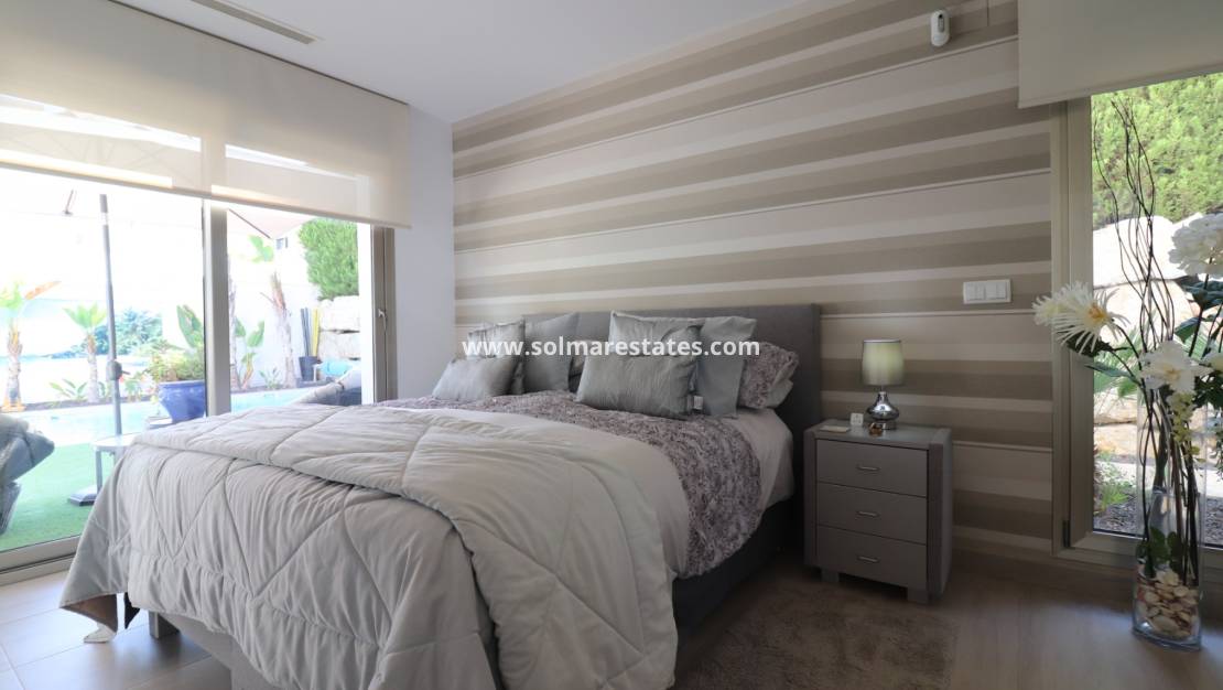 Villan ligger på en 435 m² stor tomt med 120 m² modern boyta och har ett rymligt vardagsrum och matplats med luftkonditionering och stora dubbelglasade dörrar som öppnar sig mot en lättskött trädgård med konstgräs och en privat pool.