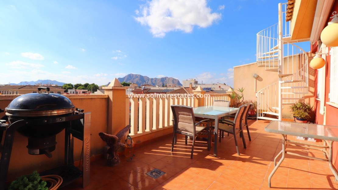 Lägenheten består av tre dubbelrum, varav två är utrustade med luftkonditionering och inbyggda garderober, samt två moderna duschrum. Det öppna köket integreras sömlöst med det ljusa och inbjudande vardagsrummet, som leder ut till en generöst tilltagen terrass – perfekt för avkoppling eller måltider utomhus. Härifrån ger en spiraltrappa tillgång till ett privat solarium komplett med ett utekök, vilket skapar ett utmärkt utrymme för umgänge medan man njuter av den fantastiska utsikten över bergen och solnedgången.