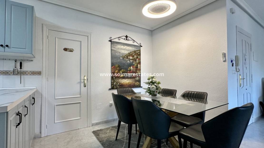 Lägenheten ligger på tredje våningen (ingen hiss) och har ett centralt men ändå bekvämt läge inom gångavstånd från stormarknader, restauranger, butiker, gokart, en vattenpark och La Zenia Boulevard , bara sex minuter bort. De vackra stränderna i Playa Flamenca kan nås på cirka 13 minuter, medan Alicantes flygplats ligger 40 minuters bilresa bort.