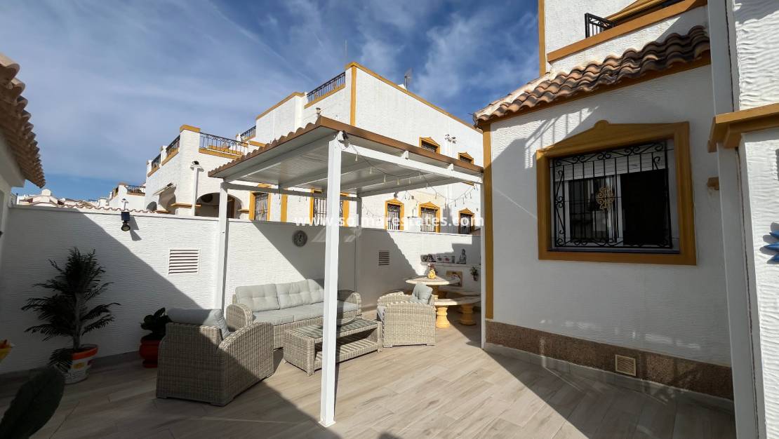 En sluten intern trappa leder upp till ett privat takterrass med härlig utsikt över den gemensamma poolen och parkområdet. Fastigheten inkluderar också ett praktiskt förråd.