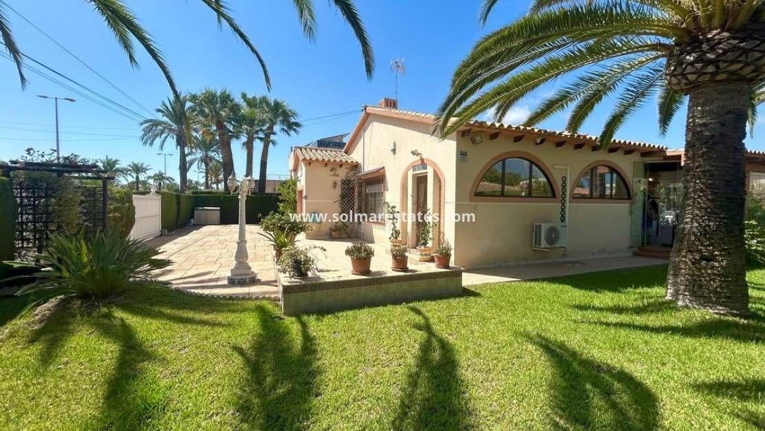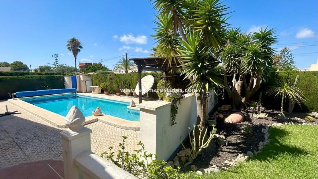 Vi är glada att presentera denna fantastiska enplansvilla i Cabo Roig, belägen bara 10 minuter från stranden i ett av de mest eftertraktade områdena i Orihuela Costa. Byggd på en 800 m² tomt med 140 m² boyta, erbjuder fastigheten en rymlig trädgård, privat pool, trädgårdshus i trä och pergola – perfekt för avkoppling och att njuta av tiden med familj och vänner.