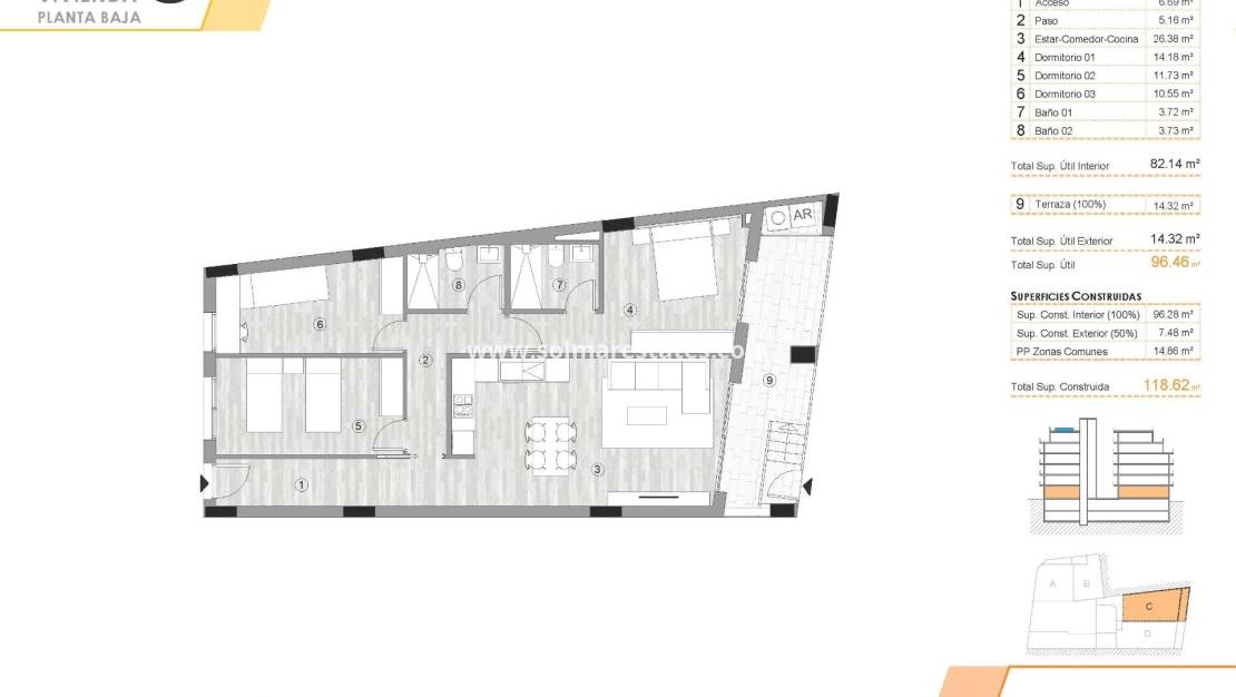Denna nya bostadsbyggnad har ett oslagbart läge i centrala Torrevieja, bara 400 m från Playa del Cura. Omgiven av butiker, stormarknader, restauranger och dagliga tjänster erbjuder den allt du behöver inom gångavstånd. Området har också tillgång till parker, fritidsområden och grönområden, vilket skapar en perfekt balans mellan urban bekvämlighet och avkoppling.