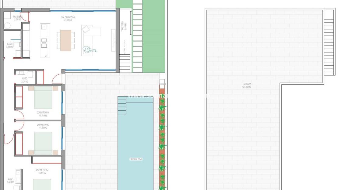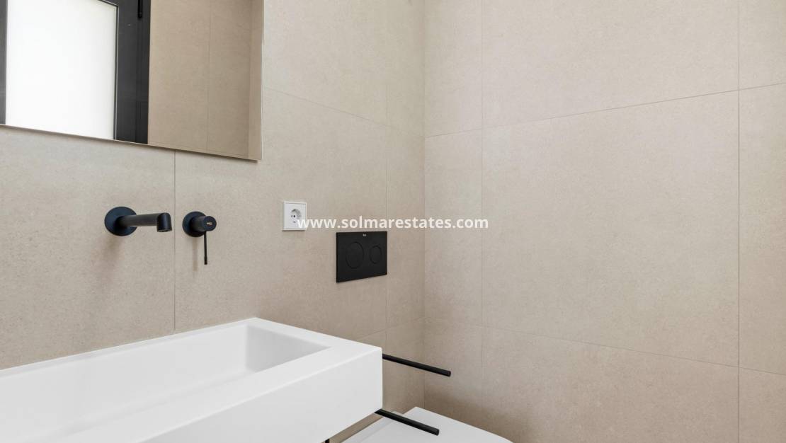 Nybyggda villor nära Serena Golf i Los Alcazares Moderna villor i ett utmärkt läge vid kusten och golfbanan Detta exklusiva nybyggnadsprojekt erbjuder moderna villor i Los Alcazares, bara en kort bit från den prestigefyllda Serena Golf och endast 1,2 km från sandstränderna i Mar Menor. Dessa bostäder ligger i ett av de mest attraktiva områdena i regionen Murcia och kombinerar modern design, komfort och ett utmärkt läge nära havet, golfbanan och alla dagliga bekvämligheter. Los Alcazares är en väl etablerad kuststad som är känd för sin avslappnade livsstil, långa strandpromenad, vattensporter och milda klimat året om. Enplansdesign med privata utomhusutrymmen Bostadsområdet består av eleganta villor med 3 sovrum och 2 badrum, tillgängliga i två olika storlekar på cirka 106 kvm och 130 kvm. Den större modellen har även en extra gästtoalett. Alla villor är utformade på en våning, vilket ger ett praktiskt och bekvämt boende. Det öppna köket, matsalen och vardagsrummet ansluter direkt till en terrass och privat trädgård med pool, vilket skapar ett idealiskt utrymme för både inomhus- och utomhusliv. Varje fastighet har också ett privat solarium och parkering på tomten. Högkvalitativa ytbehandlingar och modern utrustning Dessa villor är byggda med högkvalitativa material och utrustade med moderna funktioner. De fullt utrustade köken finns i vit högblank eller träfinish och inkluderar bänkskivor i kvarts, diskbänk i rostfritt stål, induktionshäll med integrerad fläkt, ugn, mikrovågsugn, tvättmaskin, integrerat kylskåp och diskmaskin. Badrummen är utrustade med möbler, speglar, belysning och elektriska handdukstorkar. Ytterligare funktioner inkluderar elektriska persienner i sovrummen, LED-belysning i hela fastigheten och ett komplett luftkonditioneringssystem från Fujitsu. Privat pool och energieffektiv komfort Varje villa har en privat pool med blå keramiska kakelplattor, integrerade trappsteg och vit LED-belysning. Poolen är förberedd för installation av en värmepump. Kombinationen av effektiv klimatkontroll, modern konstruktion och genomtänkt design garanterar komfort året runt. Utmärkt kommunikation och viktiga avstånd Villorna ligger inom gångavstånd från Los Alcazares centrum och mycket nära Serena Golf. Stranden ligger cirka 1,2 km bort. Cartagena ligger cirka 20 km bort och erbjuder ett rikt kulturellt och gastronomiskt utbud. Murcia Corvera internationella flygplats ligger cirka 22 km bort och Alicante flygplats ligger cirka 90 km bort. Flera golfbanor och marinor finns också i närheten, vilket gör denna plats idealisk för både permanent boende och semester. Ditt idealiska hem vid havet och golfbanan Om du letar efter en modern nybyggd villa nära stranden och golfbanan i Los Alcazares, kontakta oss idag för mer information eller för att boka en privat visning.