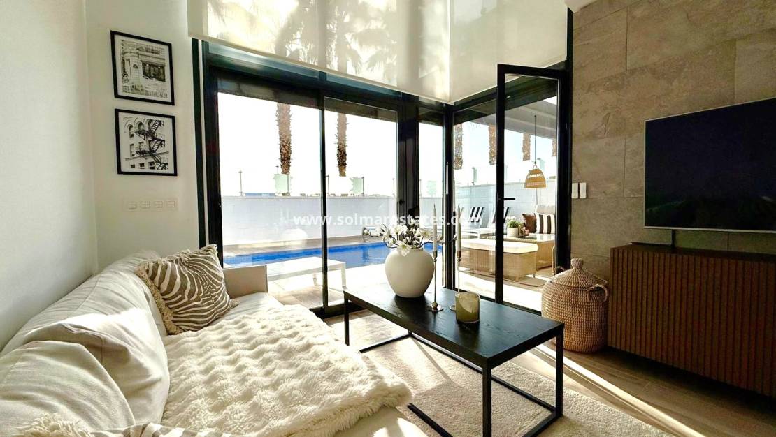 Villan öppnar sig mot en entréhall som leder till ett elegant öppet kök, matsal och vardagsrum, med stora dörrar som ger sömlös tillgång till solterrasserna och den uppvärmda privata poolen – perfekt för både avkoppling och underhållning.