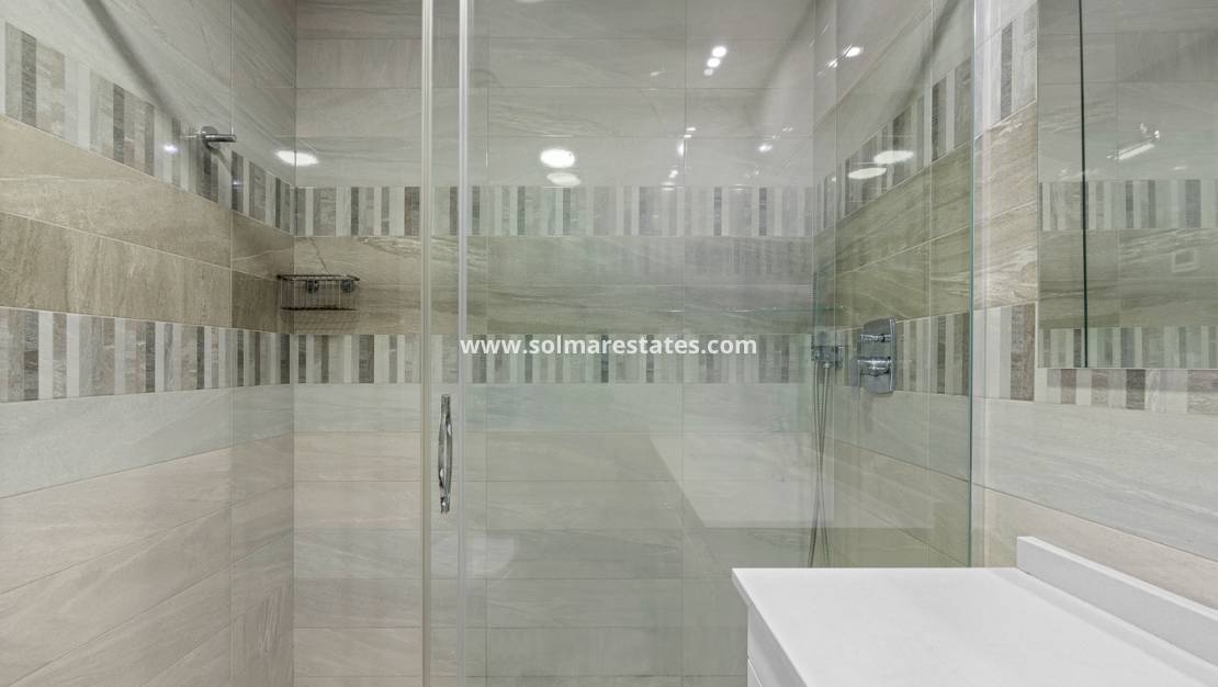 Det fullt utrustade moderna köket ansluter sömlöst till vardagsrummet, vilket gör det perfekt för vardagsliv och underhållning. Båda sovrummen är generöst tilltagna, inklusive ett sovrum med eget badrum och direkt tillgång till terrassen, vilket garanterar komfort och avskildhet.