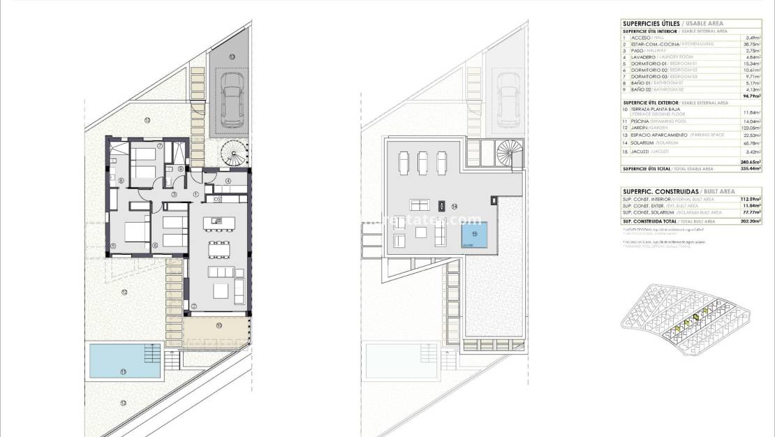NYBYGGDA VILLOR I POLOP Nybyggnation av villor i Polop erbjuder dig ett utrymme där du fullt ut kan uppleva Medelhavets livsstil. Välj mellan villor med 2 och 3 sovrum i Polop som är utformade för att fånga kärnan i Medelhavet och njuta av miljön i utomhusområden. Höjdpunkterna i detta projekt är dess hisnande panoramautsikt över två unika platser: Alteabukten med sitt djupblå hav och de majestätiska Alicantebergen med sina toppar och vegetation. Låt dig hypnotiseras av dessa otroliga vyer från terrasserna i dessa hus i Polop som också har stora utrymmen som inbjuder dig att dra nytta av det exceptionella klimatet på Costa Blanca och som du kan anpassa efter dina önskemål. Dess dimensioner är idealiska för installation av bord, stolar, solstolar eller alla utemöbler du vill ha. Projektet är tänkt och utformat för att njuta av utomhuslivet, inte bara med terrasser utan också med trädgårdar, verandor och solarium i varje hus. Dessutom erbjuder de flesta av husen i Polop möjligheten att lägga till en privat pool (infinity eller inte, beroende på tomtens egenskaper). Alternativt kan de som väljer ett envåningshus välja att installera en jacuzzi på solarium. Fördelningen av dessa villor är utformad för att ge komfort i ditt dagliga liv, med fullt utrustade öppna konceptkök, inklusive spis, induktionshäll, ugn, fläkt och handfat. Badrummen är också utrustade. Alla enheter inkluderar en parkeringsplats i priset. Läget är en lyx. Du kommer att vara belägen bara 5 minuter från centrum av "Polop de la Marina", en charmig by som kombinerar tradition med ett brett utbud av tjänster: restauranger, butiker, stormarknader, banker, sjukhus och allt du behöver för ditt dagliga liv. För att slutföra en perfekt upplevelse, mycket nära villorna hittar du flera rutter för vandring och mountainbike, tillsammans med ett sportcenter utrustat med paddeltennisbanor. För golfentusiaster finns dessutom välkända golfbanor som Villaitana Golf, mindre än 15 minuter bort med bil, bara ett stenkast bort. Och det är inte allt! En 5-minuters bilresa bort är ett av de största sportkomplexen i Spanien för närvarande under uppbyggnad: "Ciudad del Deporte La Nucia". Där kan du redan hitta den prestigefyllda Ferrer Tennis Academy och Camilo Cano Olympic Stadium. Detta utvecklingskomplex inkluderar ett fotbollscenter, den största surfparken i Spanien med vågbassänger, boende för idrottare och utbildningscentra. Och vi får inte glömma de fantastiska stränderna på Costa Blanca, som sträcker sig längs 244 kilometer kustlinje, och vackra Altea, en av de mest pittoreska byarna i landet. Dessutom hittar du förstklassiga golfbanor och infrastrukturer som Alicante-Elche Miguel Hernandez flygplats, bara 50 minuter bort med bil. 857