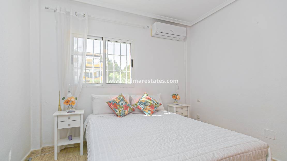 Utomhus ligger fastigheten på en väl tilltagen hörntomt med en lättskött uteplats och en generös terrass på övre våningen, perfekt för att njuta av det soliga klimatet. Huset är utrustat med luftkonditionering och har förråd både inomhus och utomhus.