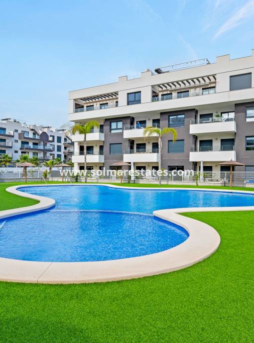 Modern, som ny lägenhet till salu på Sun Golf Beach, Las Filipinas, en populär förort till Villamartin, som ligger bara 5 minuters bilresa från Villamartin Golfbana och Plaza eller La Fuentes kommersiella centrum. Denna ljusa och rymliga lägenhet på andra våningen har 2 dubbelrum, 2 badrum med duschkabin och ett vardagsrum/matsal med öppen planlösning och ett modernt fullt utrustat kök strategiskt placerat på ena sidan av lägenheten, vilket ger en känsla av separation. Lägenheten har två stora terrasser: en i österläge, perfekt för att njuta av morgonsolen och frukosten, och en annan i västerläge, perfekt för solnedgångar. Terrassen som vetter mot öster erbjuder även havsutsikt. Fastigheten inkluderar myggnät på alla fönster, vilket garanterar komfort året runt. Säljes omöblerat men med extrafunktioner som luftkonditionering, vitvaror, förinstallation för internet och en privat underjordisk parkeringsplats. Byggd av en känd lokal byggare känd för kvalitet och stil, denna fastighet visar upp modern design och material av högsta kvalitet. Det inhägnade komplexet erbjuder gemensamma trädgårdar, en pool och säker parkering för boende. Utmärkt läge nära bekvämligheter, inklusive Mercadona stormarknad och La Fuente Commercial Centre. En kort bilresa till Villamartin Golfbana, Plaza, och bara 4 km från flera blåflaggade stränder på Orihuela Costa. Semesteruthyrningspotential: Turistlicens krävs för uthyrning. Kontakta Inmo Investments idag för mer information eller för att boka en visning.