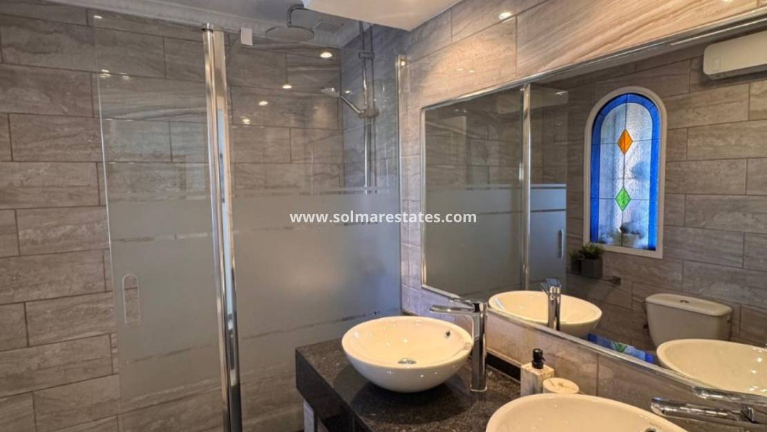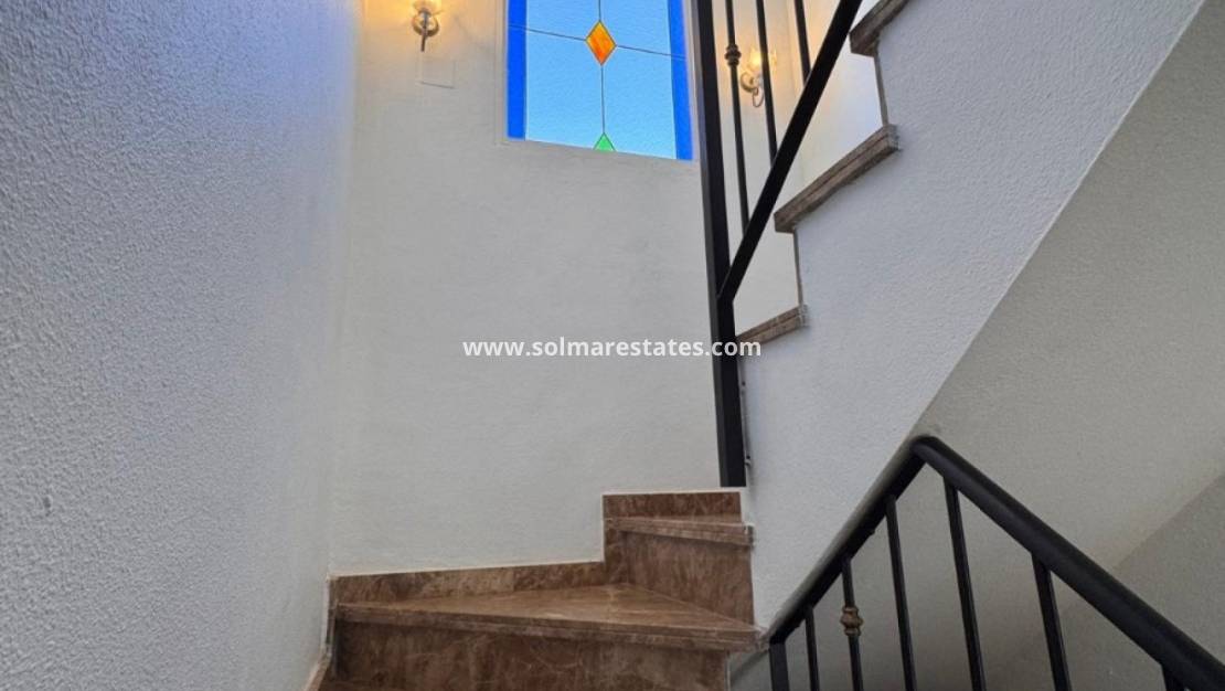 En marmortrappa, upplyst av ett utsmyckat fönster, leder upp till ett stort sovrum i söderläge med utgång till terrass, inbyggda garderober och luftkonditionering. Ytterligare ett generöst sovrum med takfläktar, luftkonditionering och ett andra badrum med dusch och dubbla handfat kompletterar övervåningen.