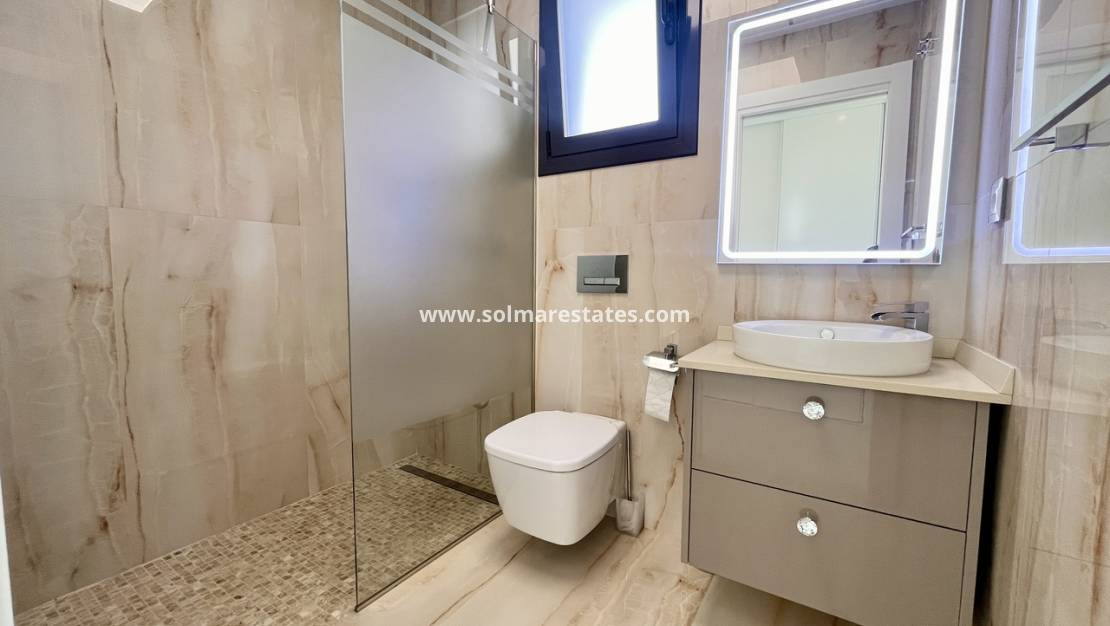 När du stiger upp till första våningen kommer du att upptäcka två generöst tilltagna sovrum, två badrum och tillgång till charmiga balkonger. Kronjuvelen i denna lyxvilla är solariet på översta våningen på 70 m², som ger en oöverträffad utsiktsplats för att njuta av panoramautsikt.