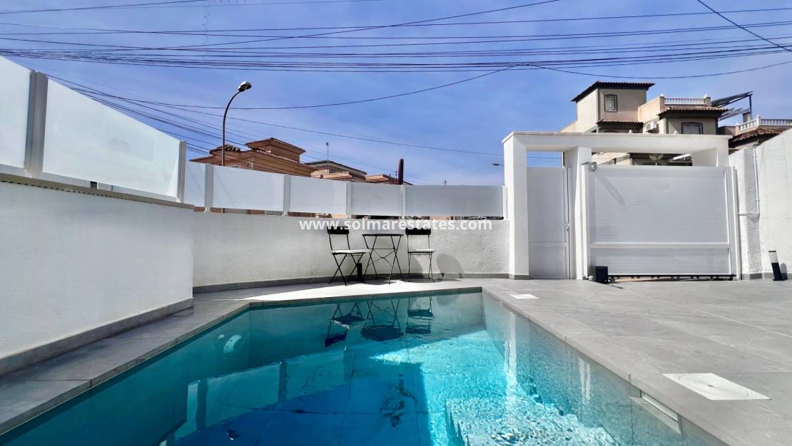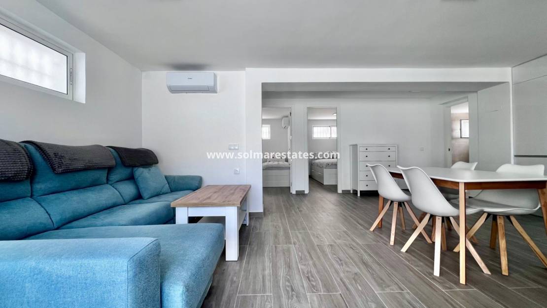 Denna helt renoverade hörnvilla i Villamartin erbjuder en mångsidig planlösning och ett lugnt bostadsområde med utmärkta förbindelser. Belägen på en tomt på cirka 300 m² är fastigheten disponerad som två separata bostadsutrymmen, vilket ger flexibilitet för boende med större familjer eller gästboende.