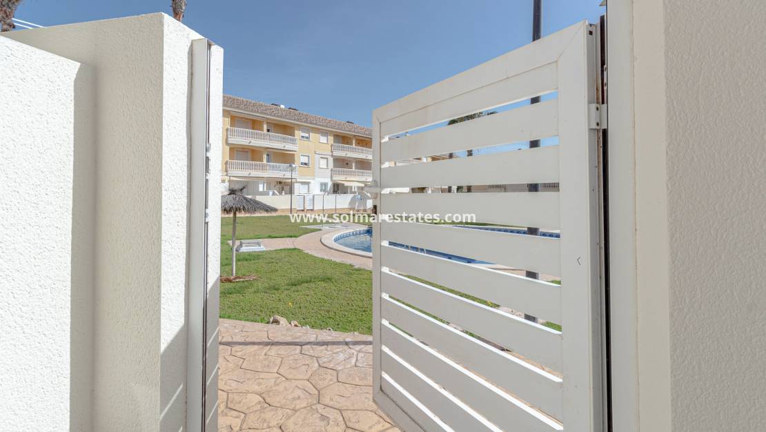 På bottenvåningen hittar du ett ljust och luftigt vardagsrum/matsal med praktisk förvaring under trappan, ett moderniserat duschrum med toalett och ett separat fullt utrustat kök. Köket leder direkt ut till en solterrass på baksidan, vilket ger enkel tillgång till den vackert underhållna gemensamma poolen och trädgårdarna – en av de mest framträdande dragen i denna urbanisation.