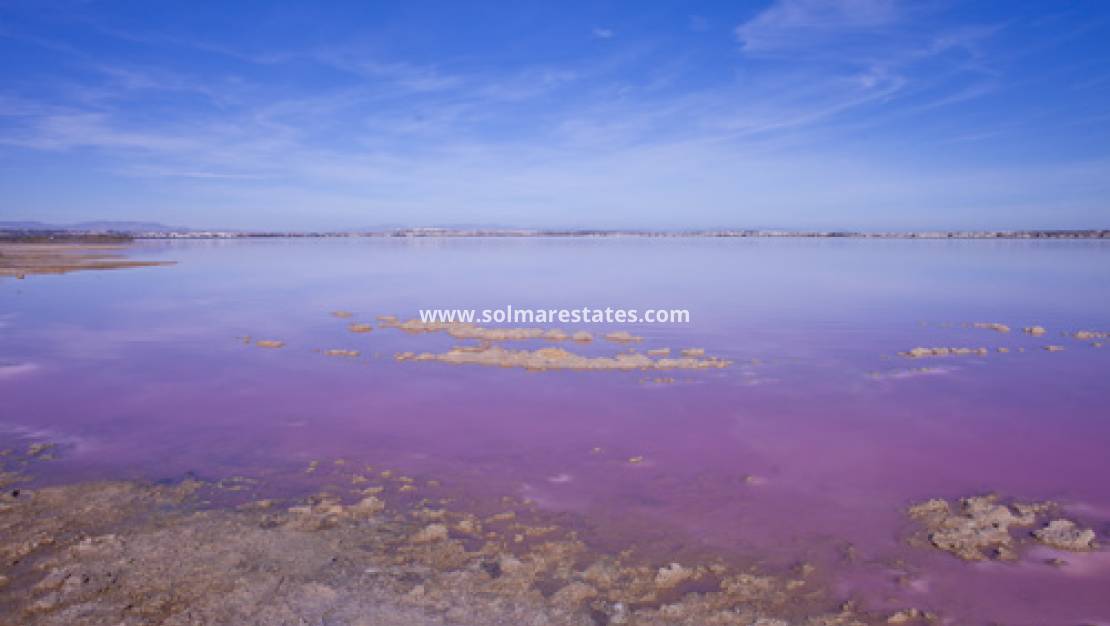 På övervåningen finns två soliga sovrum, ett familjebadrum och en generös balkong med fantastisk utsikt. Härifrån kan du njuta av utsikten mot den berömda Laguna Rosa de Torrevieja på ena sidan och Medelhavet på den andra.